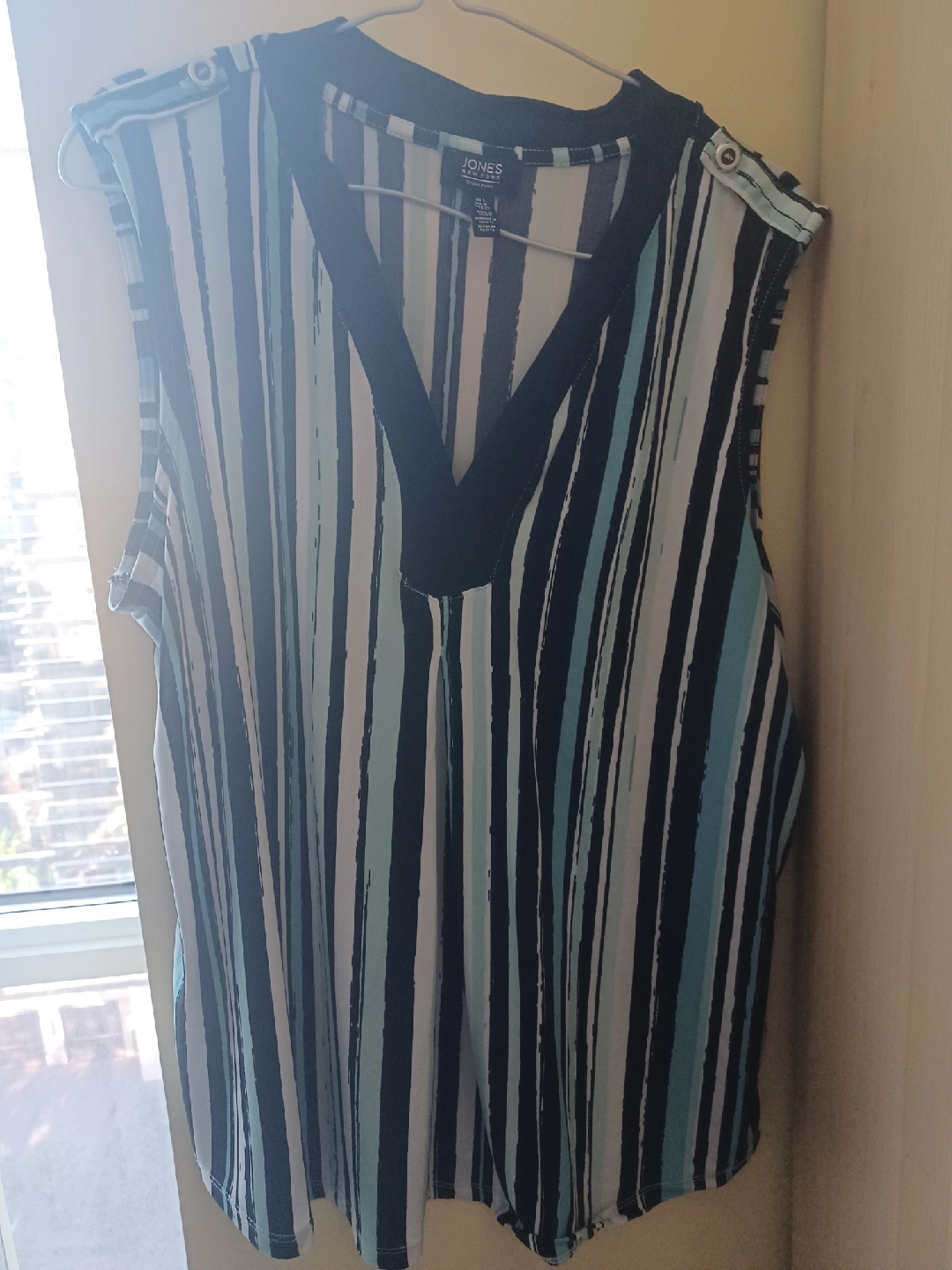 Jones New York sleeveless top in size L The top features a striped pattern in blue, white, and black. It is in great condition and ready for a new home! yonge and Sheppard tues 30th Sept pick up