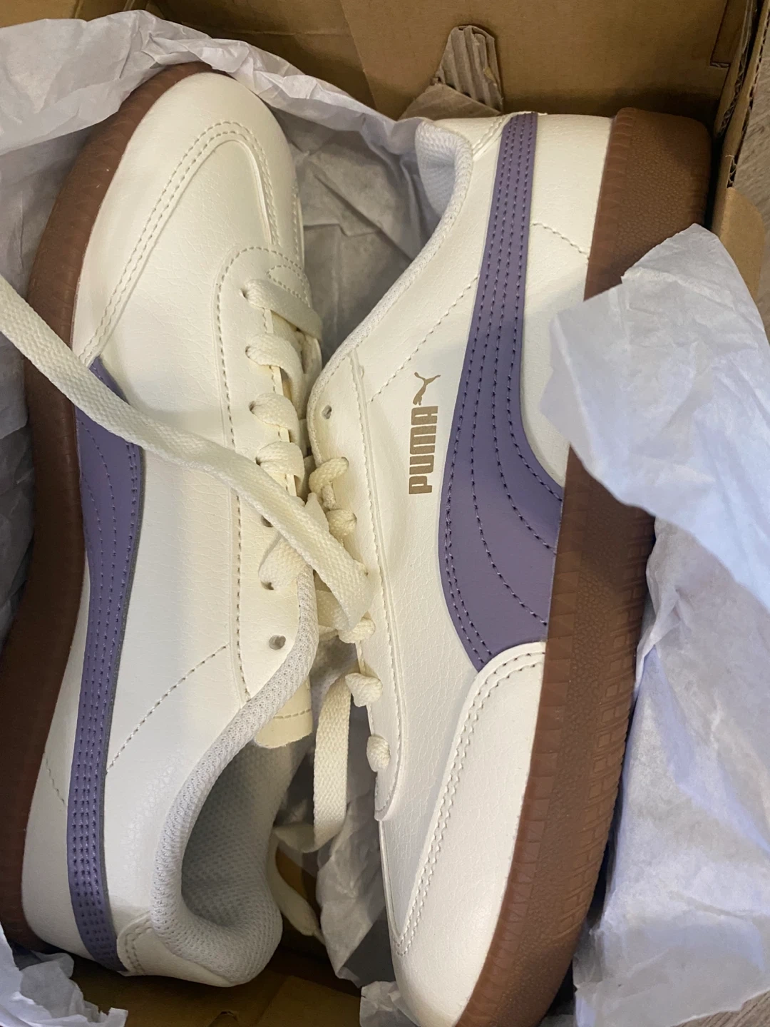 Purchased these in Porto Portugal Selling a pair of Puma shoes in a lovely cream and purple colourway! They come with the original box. These are brand new in box Size 6 ladies Price is firm