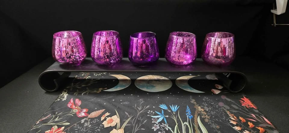 5 purple speckled glass tealight votives in an iron stand. Glows beautifully when lit. Pickup Northside Port Coquitlam