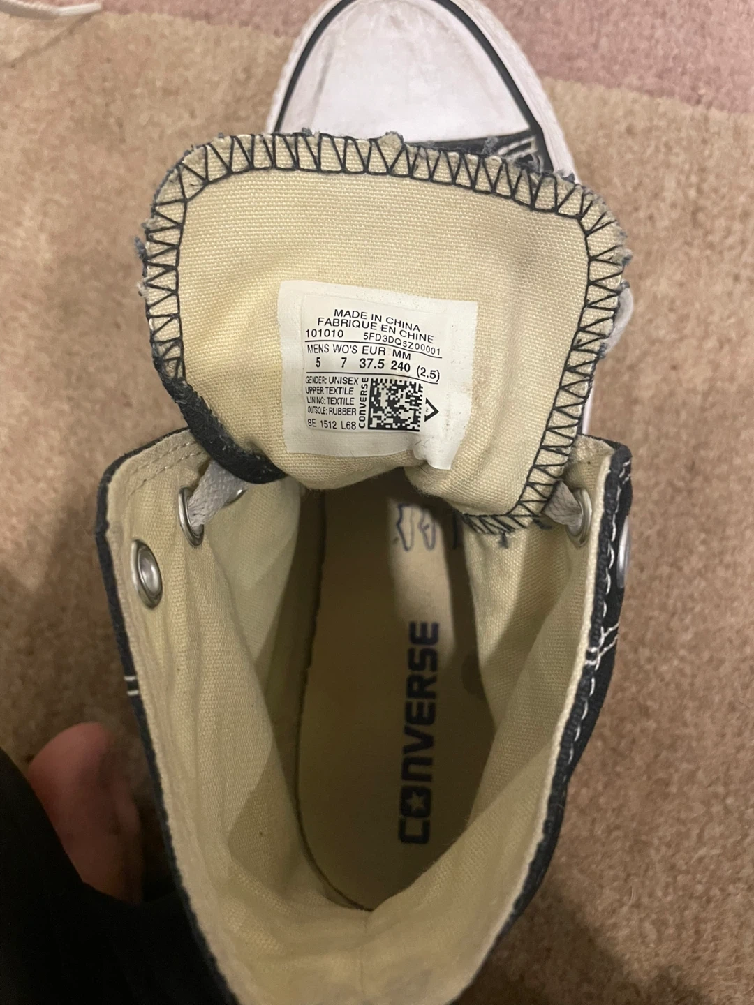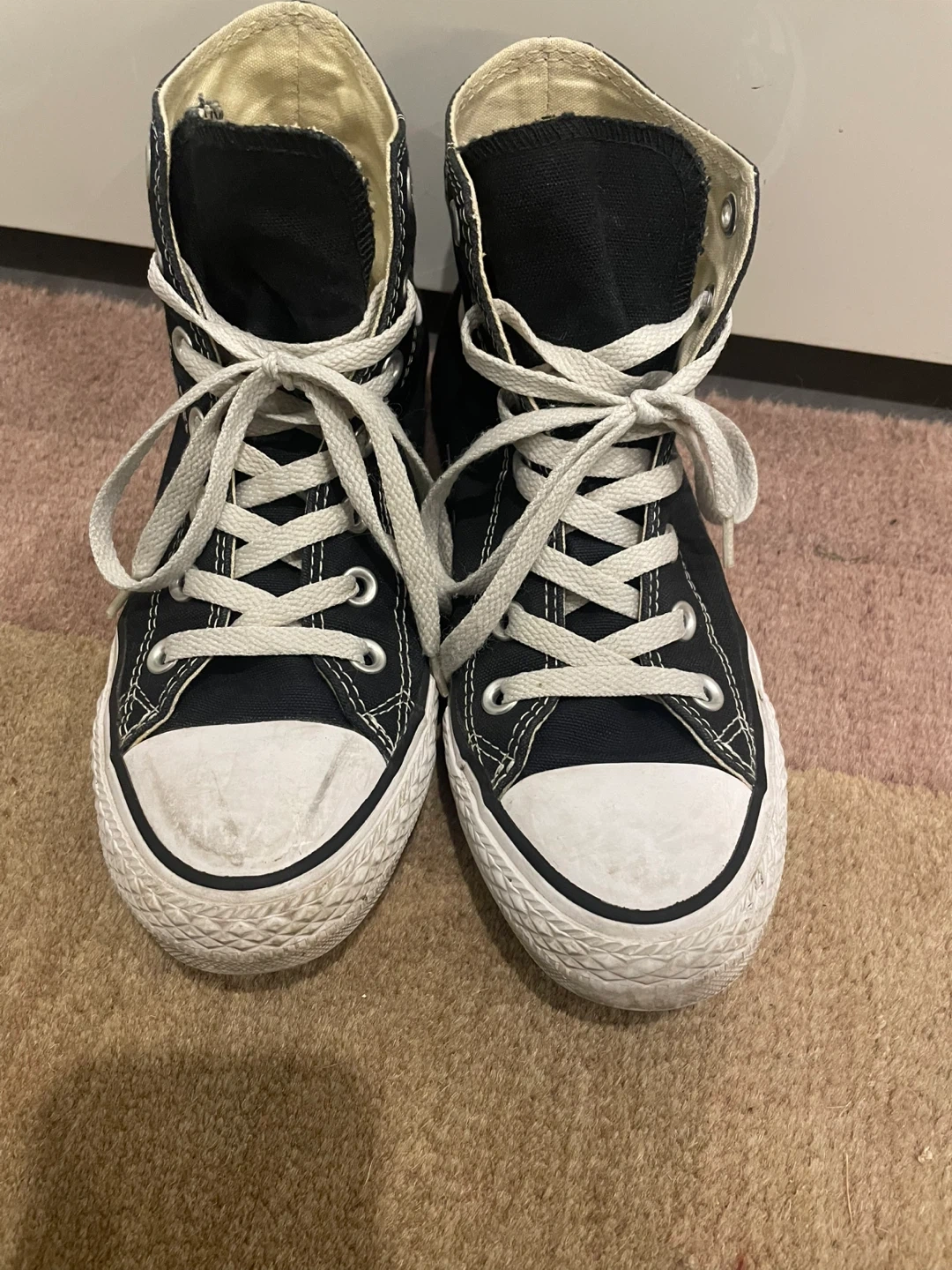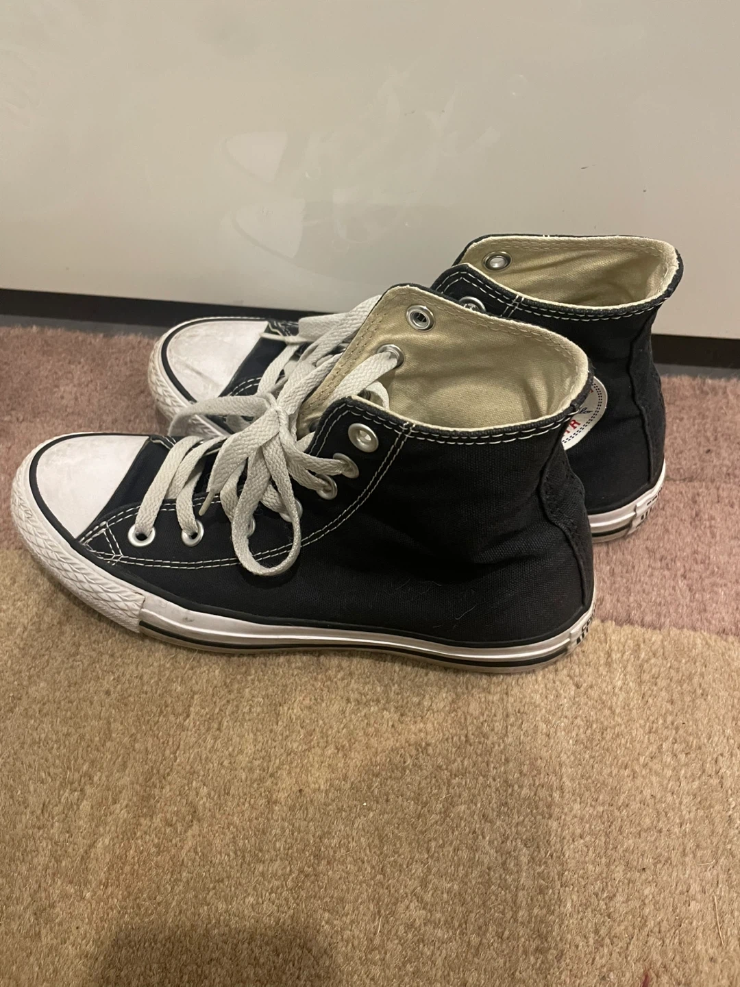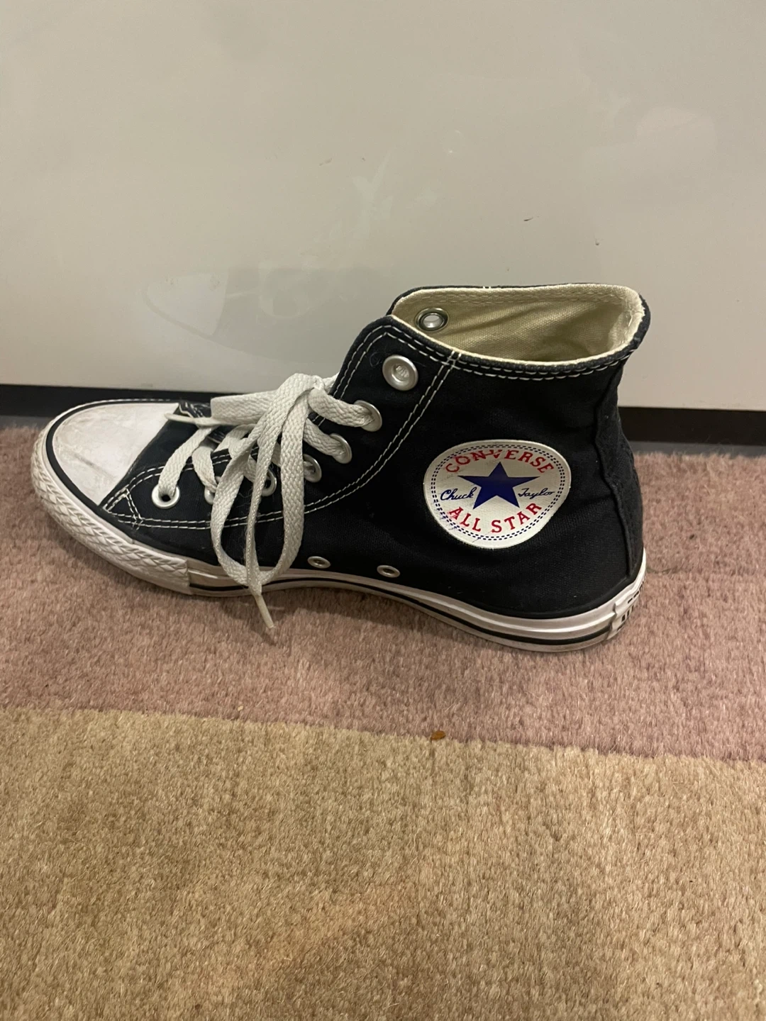 Classic black Converse Chuck Taylor All Star high tops in women's size 7! These iconic sneakers are in good used condition, perfect for adding a touch of cool to any outfit. They have the classic Converse look with the white rubber toe cap and the star logo on the side