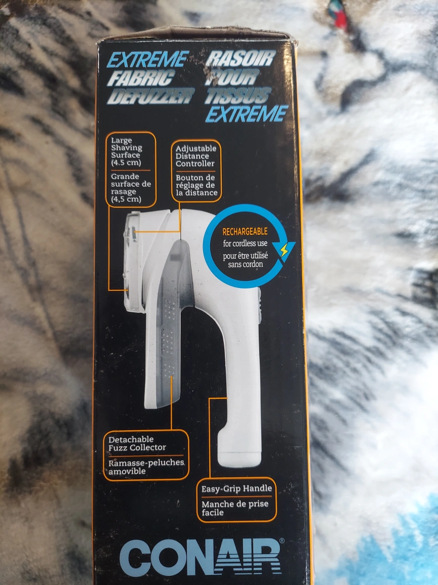 Selling a Conair Extreme Fabric Defuzzer! This handy gadget removes fuzz and lint. It features a large shaving surface (4.5 cm), quick and even shaving, and an adjustable setting distance. It also has a detachable lint catcher and is rechargeable for cordless use! Box included