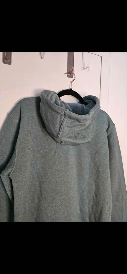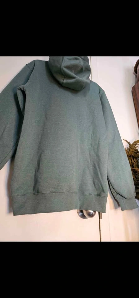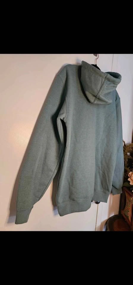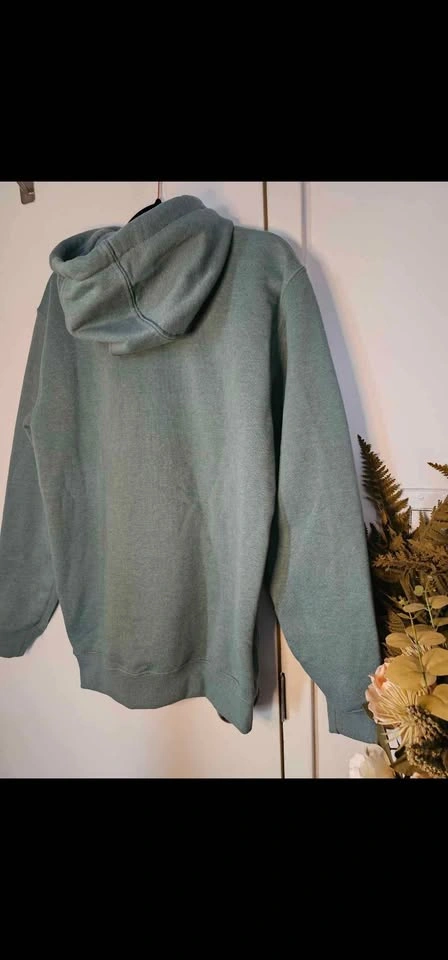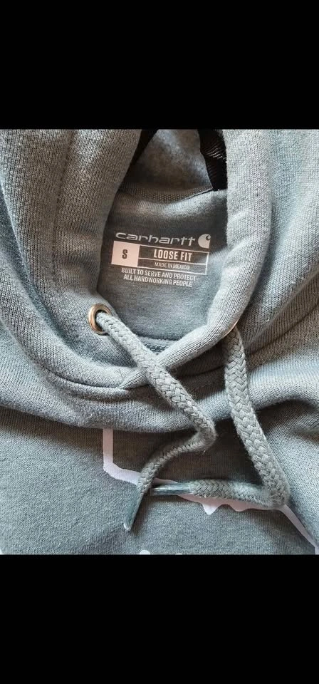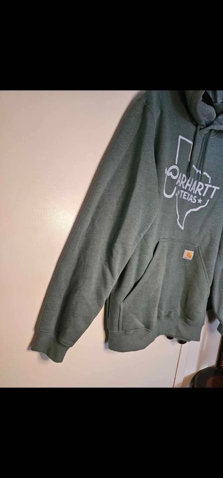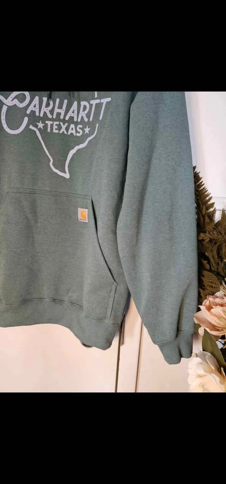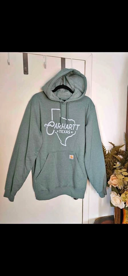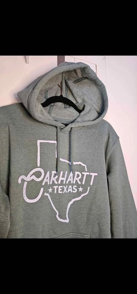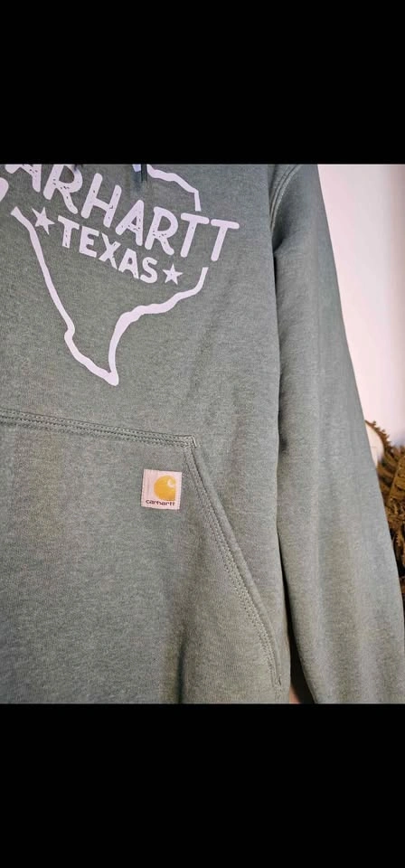 Cozy and casual light teal blue Carhartt men's/ unisex hoodie, with a pale blue graphic print of Texas and the brand logo. Hoodie is a size small, loose fit style, and has the classic Carhartt patch on the kangaroo pocket. Made of a thick and warm material that has fleece on the inside. Hoodie is in like new condition. Pit to pit measures about 21.5", pit to sleeve hem measures about 23", and shoulder to bottom hem measures about 29".