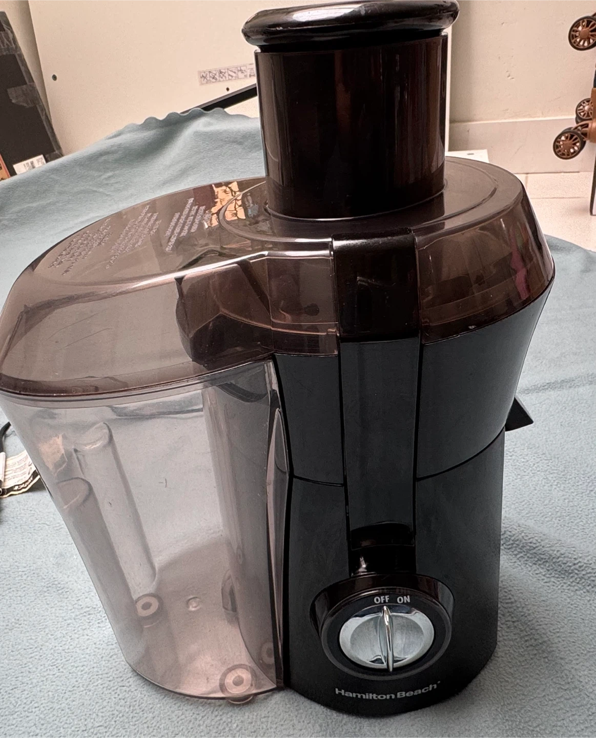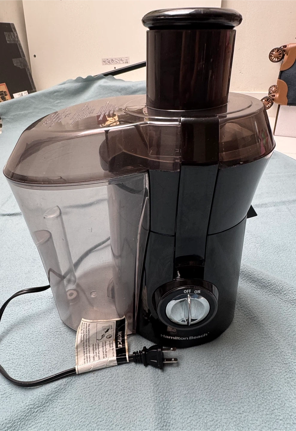 Selling a Hamilton Beach juicer in great condition! It's perfect for making fresh juice at home. It's black and clear, and has an on/off switch. Easy to use and clean, it's a great addition to any kitchen