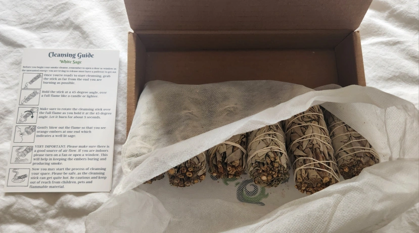 I'm selling a set of Sarimoire White Sage Cleansing Sticks! They are brand new and come in the original box. Perfect for cleansing your space and creating a good source of airflow while burning. Please be safe and keep out of reach from children, pets and flammable material