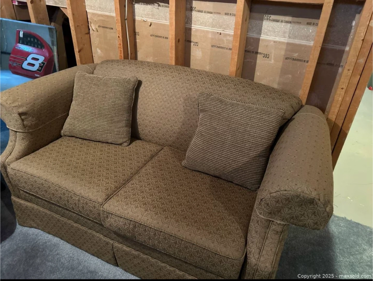 - Item type: Loveseat (two-seat sofa) - Seating capacity: 2 - Color: Taupe/Brown - Upholstery: Woven fabric - Condition: Excellent condition - Dimensions (overall): Length 58–70 in x Depth 30–36 in x Height 30–36 in - Included accessories: 2 matching throw pillows