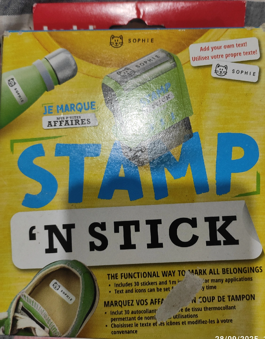 Get organized with this Sophie Stamp 'N Stick label maker! It's the perfect way to mark all your belongings. The set includes 30 stickers and 1 m of iron-on fabric tape. Text and icons can be easily set for many applications. Great for quickly labeling all your items!