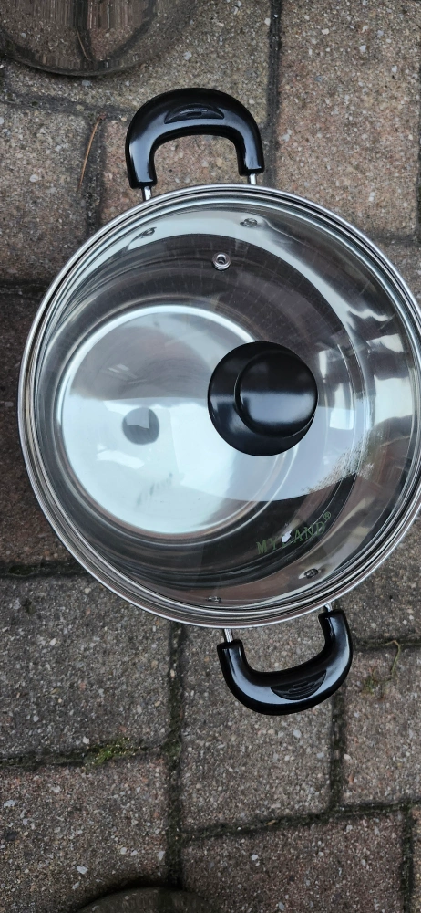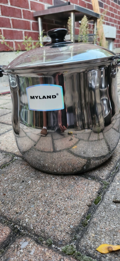 I'm selling a Myland stainless steel stock pot. It comes with a glass lid and black handles. It's in great condition and ready for your next soup or stew!