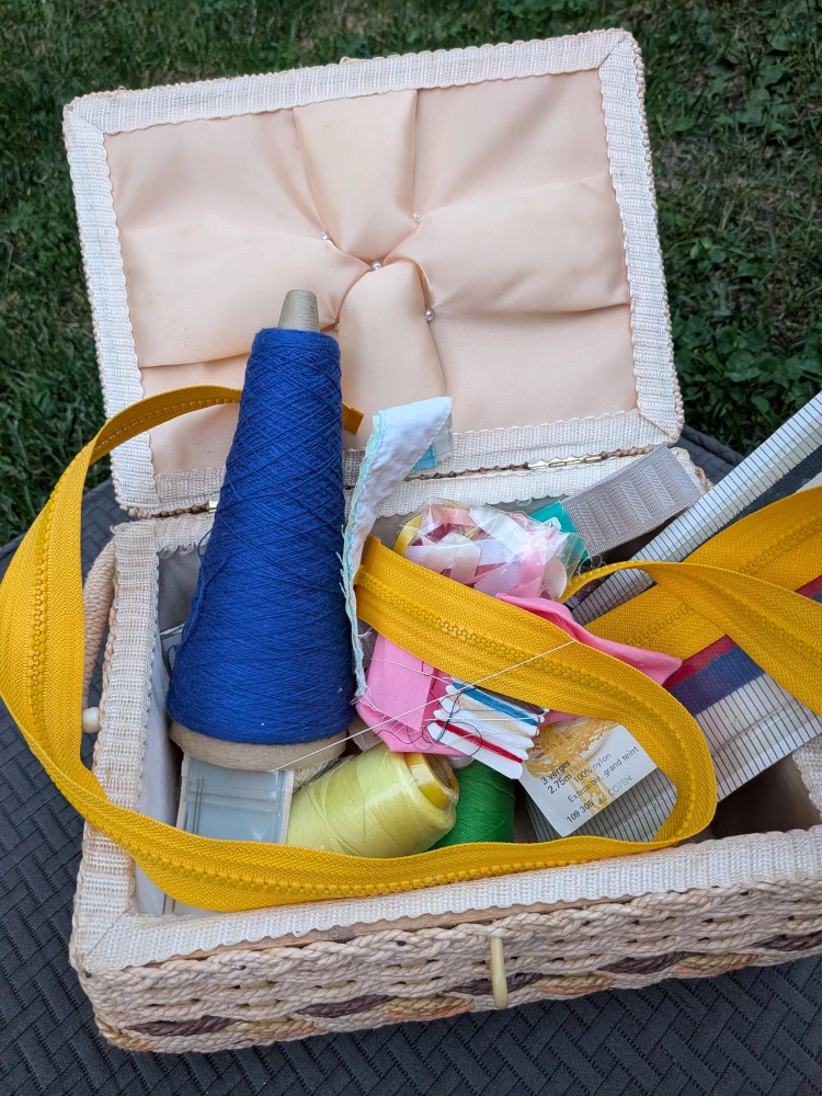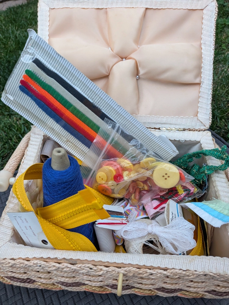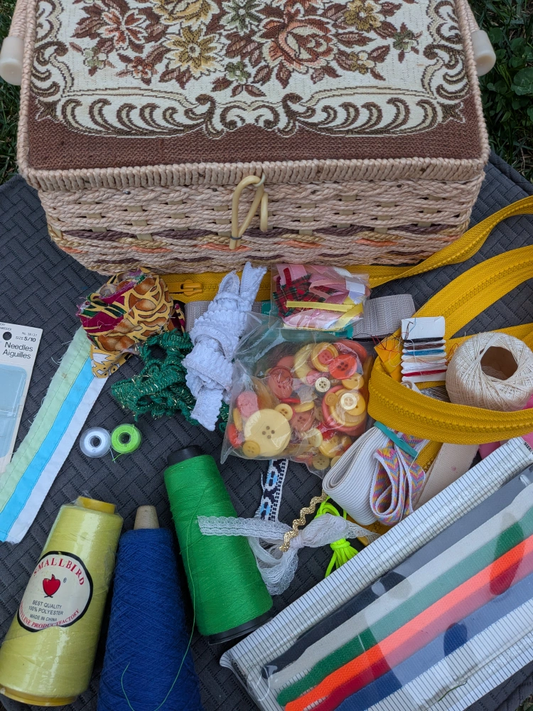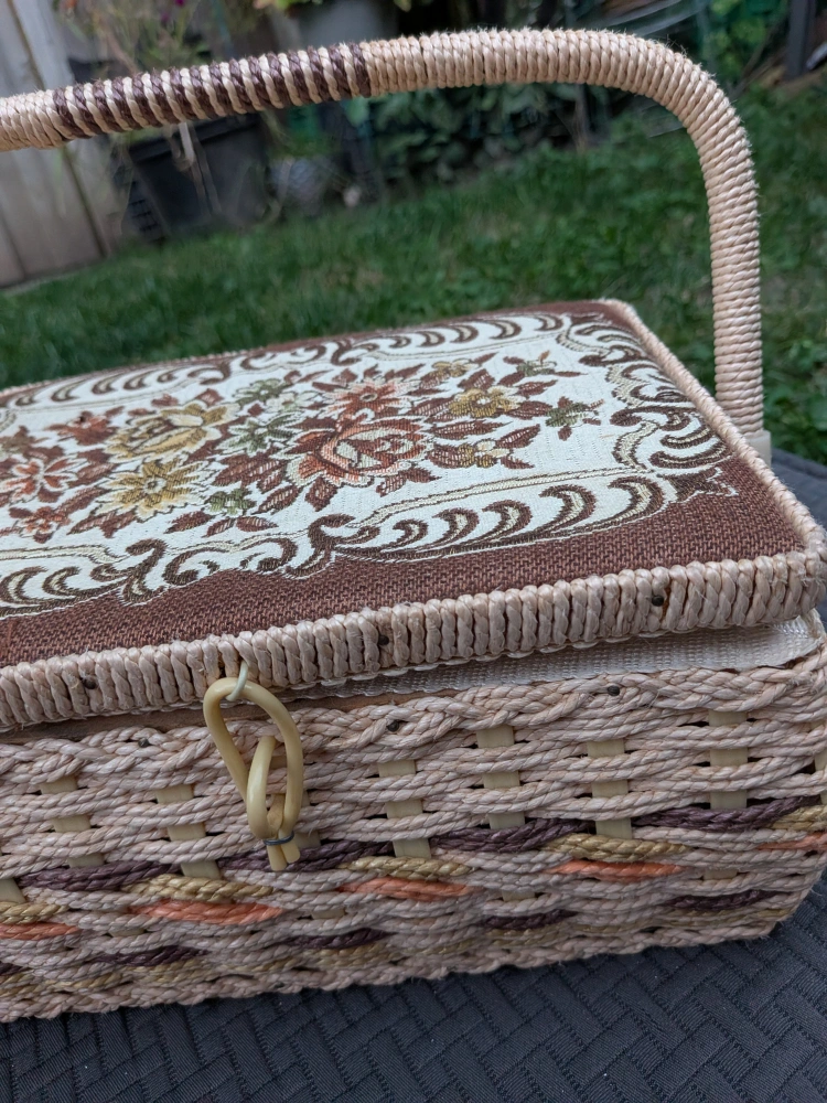 Selling a charming vintage wicker sewing basket! It comes with a variety of sewing supplies, including thread, buttons, zippers, and other notions. The basket itself has a lovely floral tapestry lid and a sturdy handle. Perfect for anyone who enjoys sewing or crafting! ** Vintage sewing basket full of accessories ** Not new, but good condition with no issues. No tears, stains etc. Contents include: bag of vtg buttons, 2 bobbins with thread. Vintage lace & trim pieces, ribbon pieces, zippers, spools of thread, elastic trim, embroidery thread, velcro pieces, needle, straight pins, etc Measures about 10 x 7 inches, about 5 inches top to bottom Cash only, no etransfers *** Meet up location: Etobicoke, near Etobicoke Olympium. Main intersection is Rathburn Road and Renforth Drive No holds, first come, first serve
