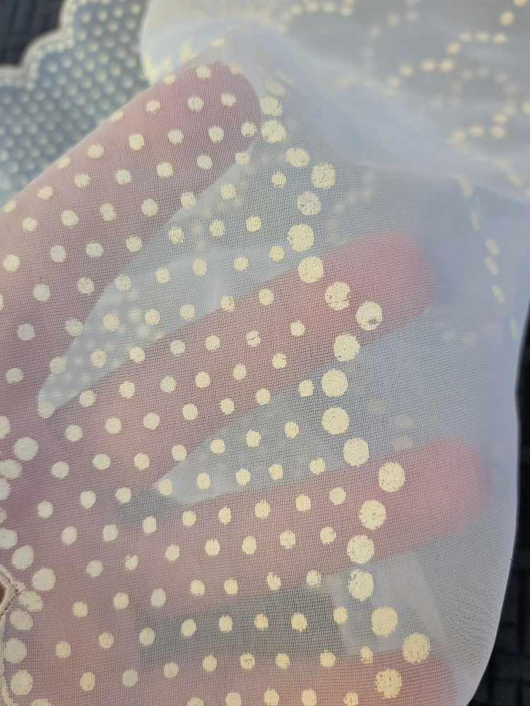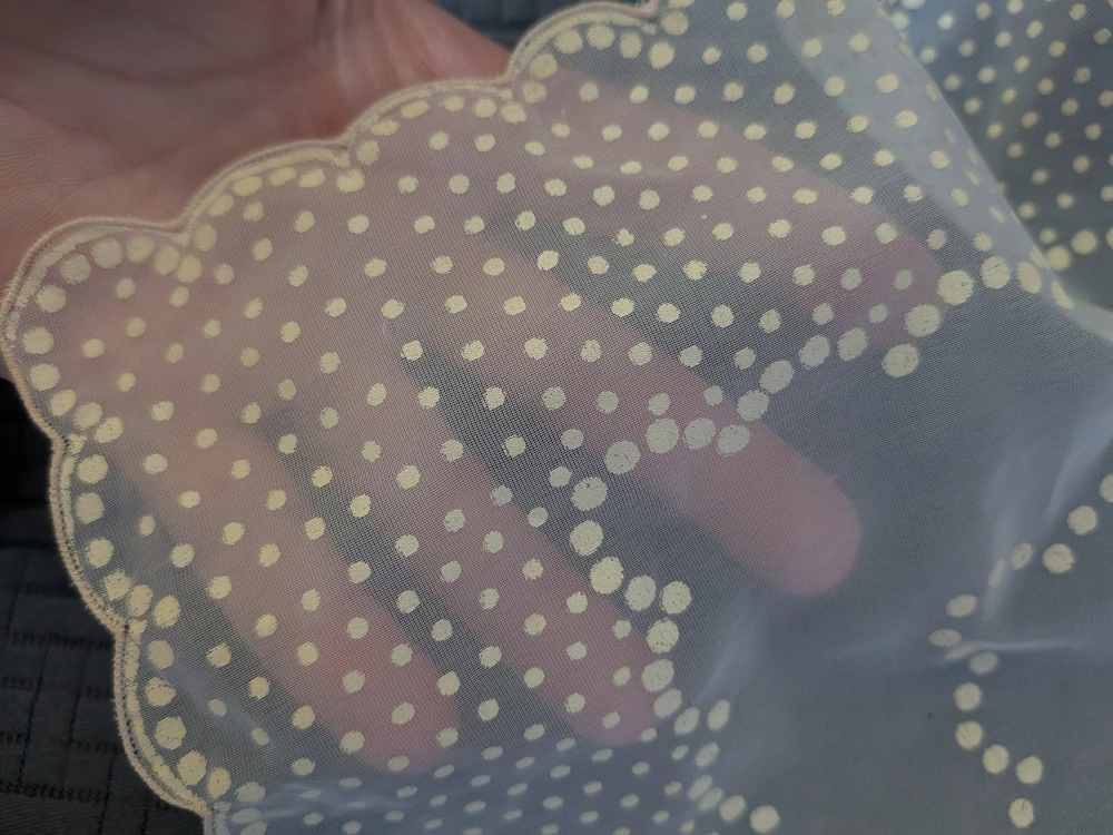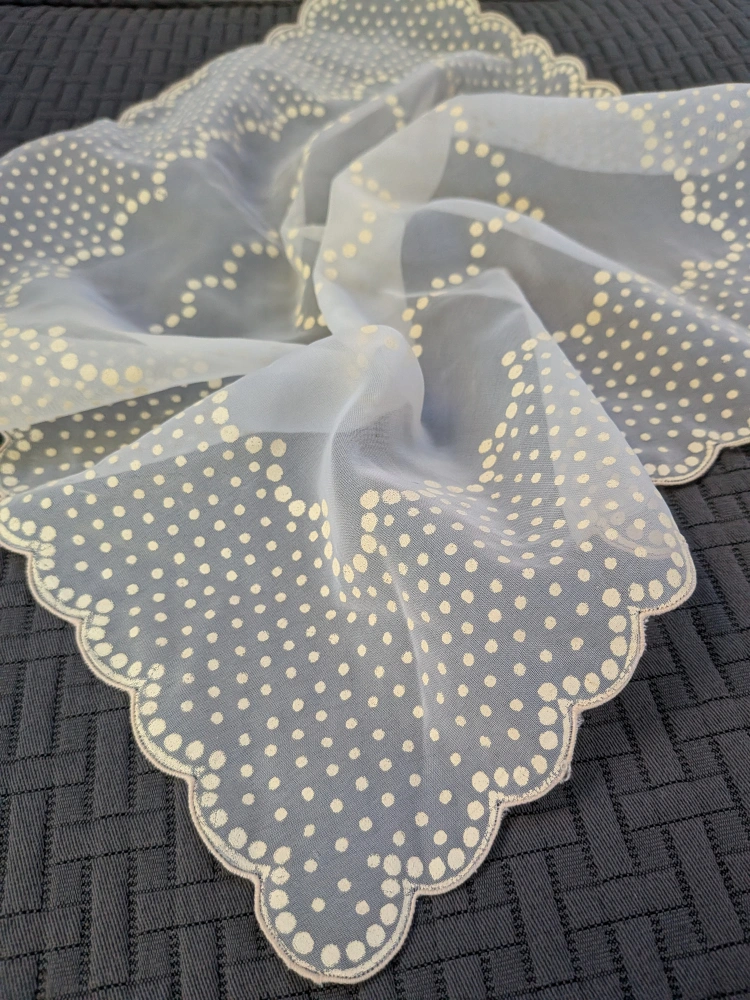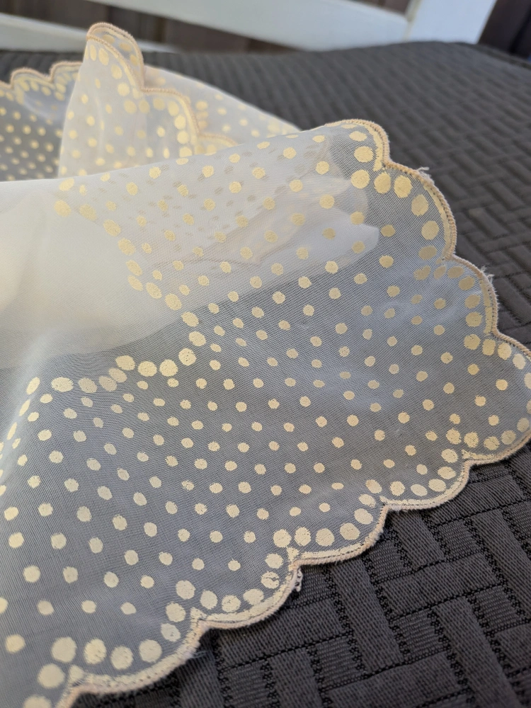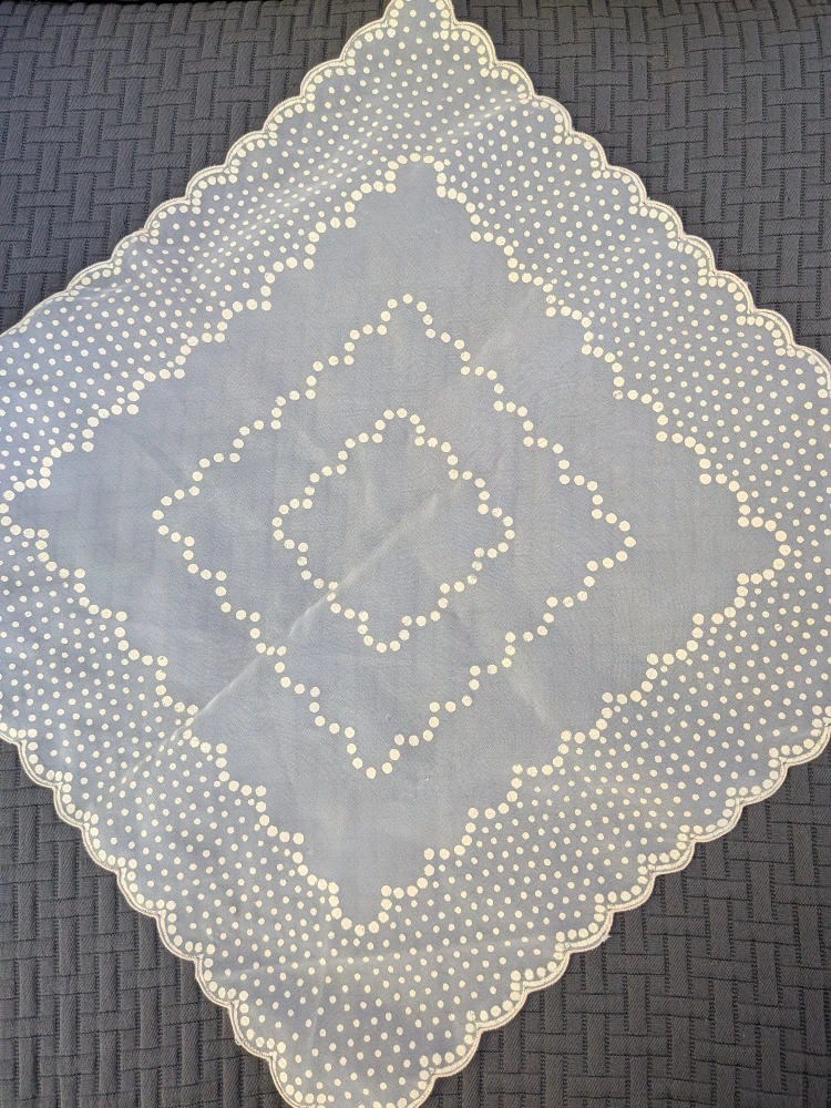 Selling a beautiful vintage handkerchief from the 50's era. It's a light, sheer white nylon material with a delicate polka dot pattern. The edges have a lovely scalloped design. Good condition despite its age. No stains, tears, holes, but paint has come off dots in some places Measures about 13 x 13.5 inches Cash only, no etransfers Location: Etobicoke. Rathburn Rd and Renforth dr. Etobicoke Olympium nearby