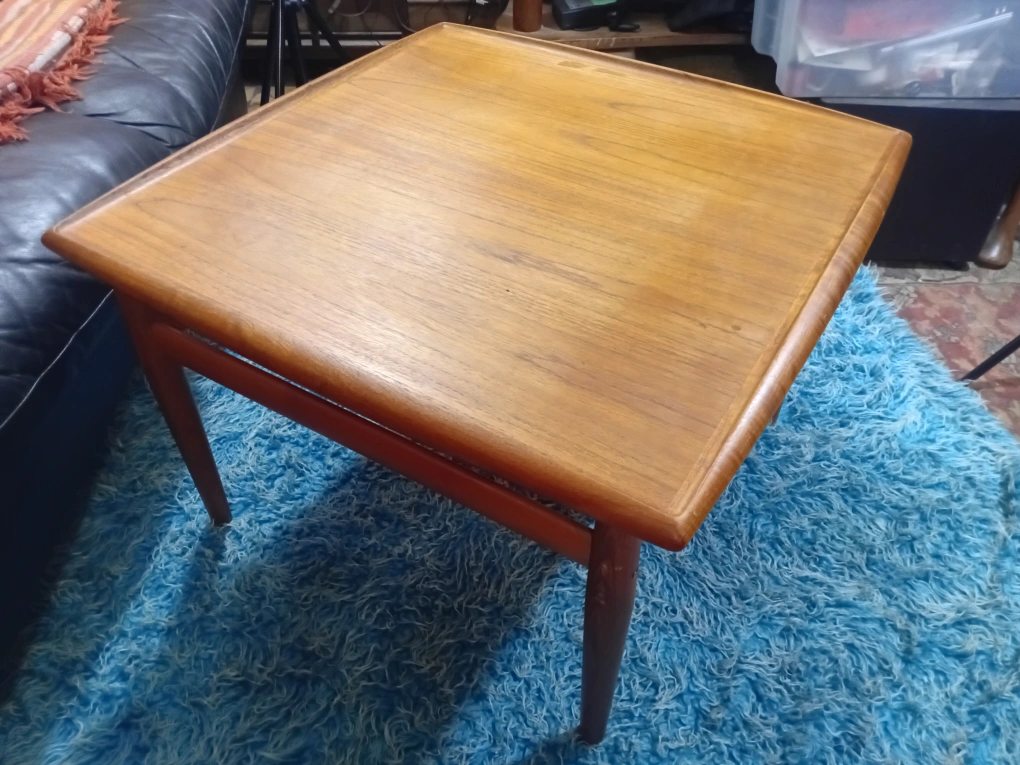 A lovely Teak wood side table. DESIGNED and SIGNED by mid century Danish designer, GRETE JALK. Perfect for any room! 27x27 19 inches in height. A great addition to your home decor. https://share.google/images/bBgyYdWOFP2PYS77O *MINT CONDITION!!! mid-century, Teak wood, furniture, table