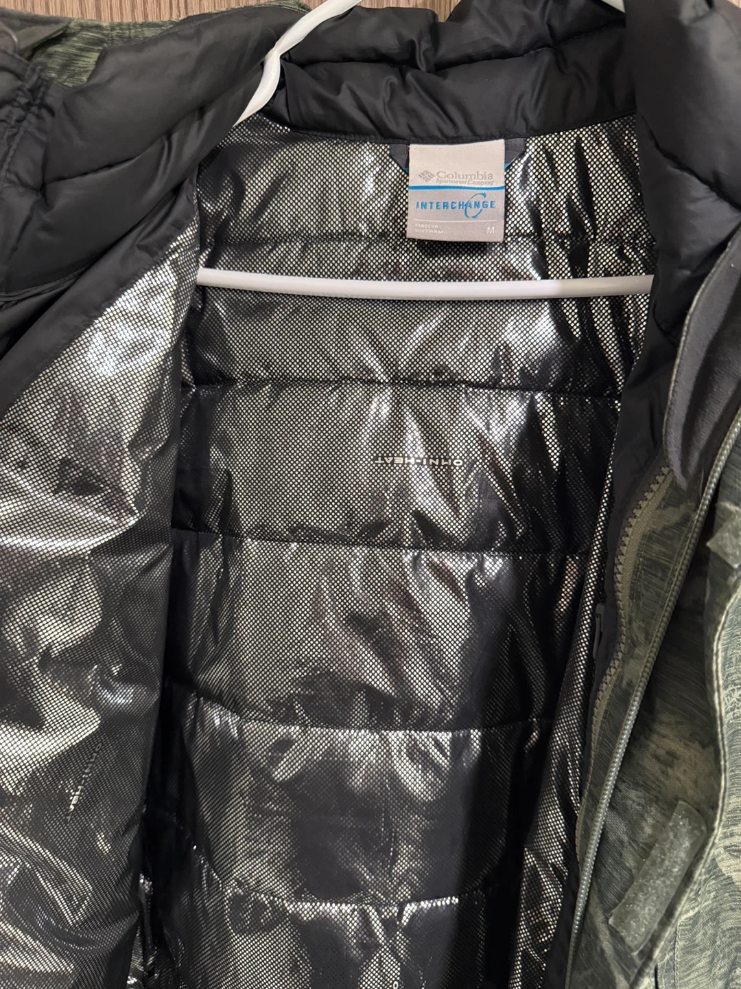 Selling a Columbia Interchange 2-1 Jacket in excellent condition! It's a men's size M and features Columbia's Interchange system, making it versatile for different weather conditions. The jacket has a unique camouflage pattern in shades of green and grey, and the inner lining provides extra warmth and comfort. Perfect for outdoor activities or everyday wear!