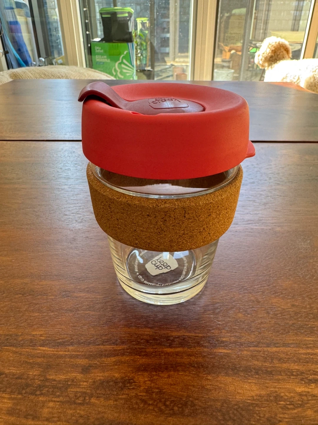 KeepCup Brew Cork Edition reusable cup is up for grabs! It's a great way to enjoy your coffee or tea on the go while being eco-friendly. This KeepCup is made with glass and features a cork band for a comfortable grip and heat protection