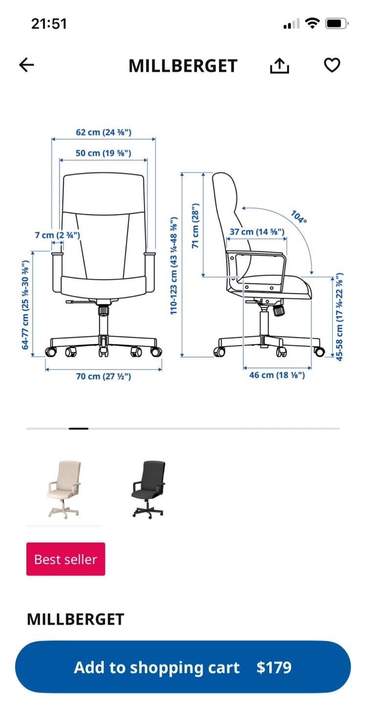 Looking to sell my beige IKEA Millberget office chair. It's in great shape and super comfy for working from home! The chair has adjustable height from 110-123 cm (43 ¼-48 ⅜") and the seat is 50 cm (19 ⅝") wide. Originally bought for $179