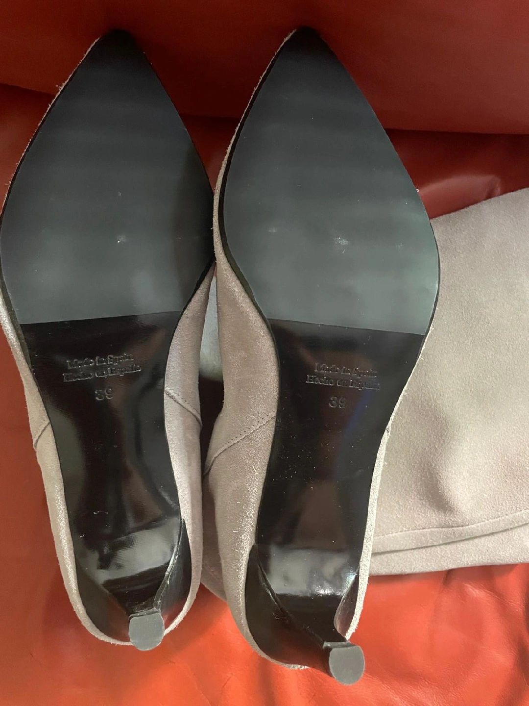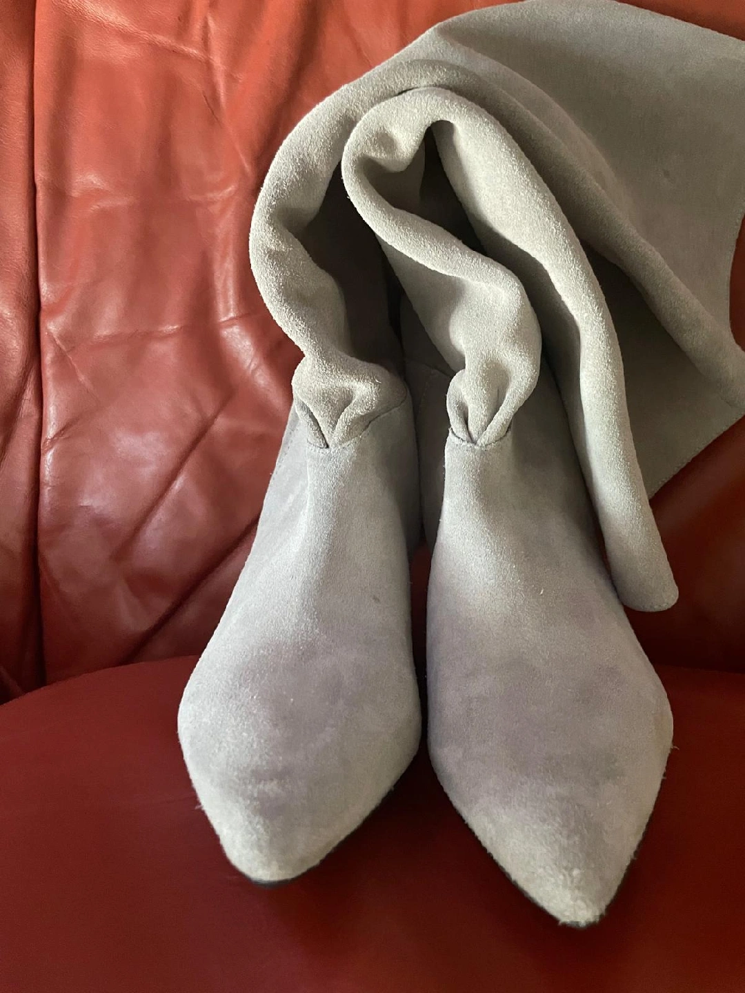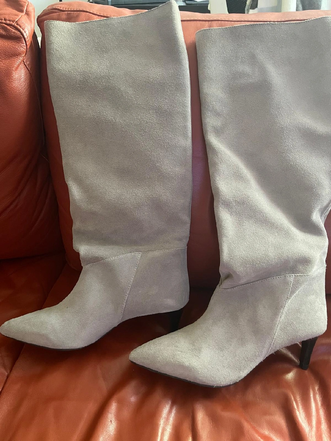 Selling a pair of stylish long boots! They are a lovely grey suede and in great condition. The size is 39, which is approximately a US/Canadian size 8 or 9. These boots are perfect for adding a touch of elegance to any outfit
