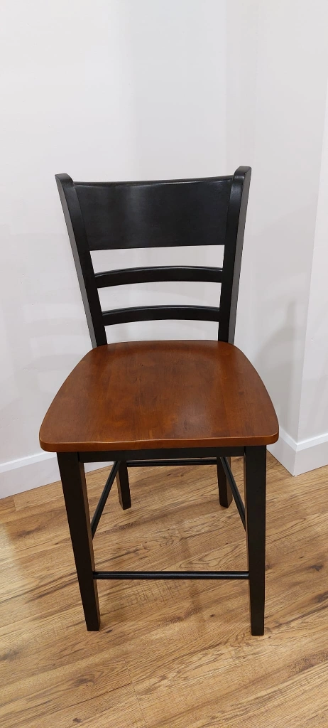 Selling a pub stool with a wooden seat and black frame. It's never used, comes in a package and would be a great addition to any kitchen or dining area. Comes in a package. It fits easily in your car While assembling the chair, I over-tightened the screw and it went through the leg, leaving a tiny hole. That's why I'm selling $35.