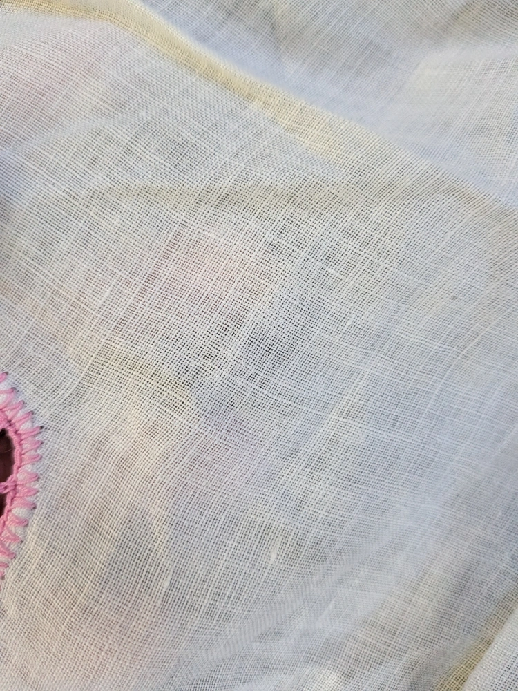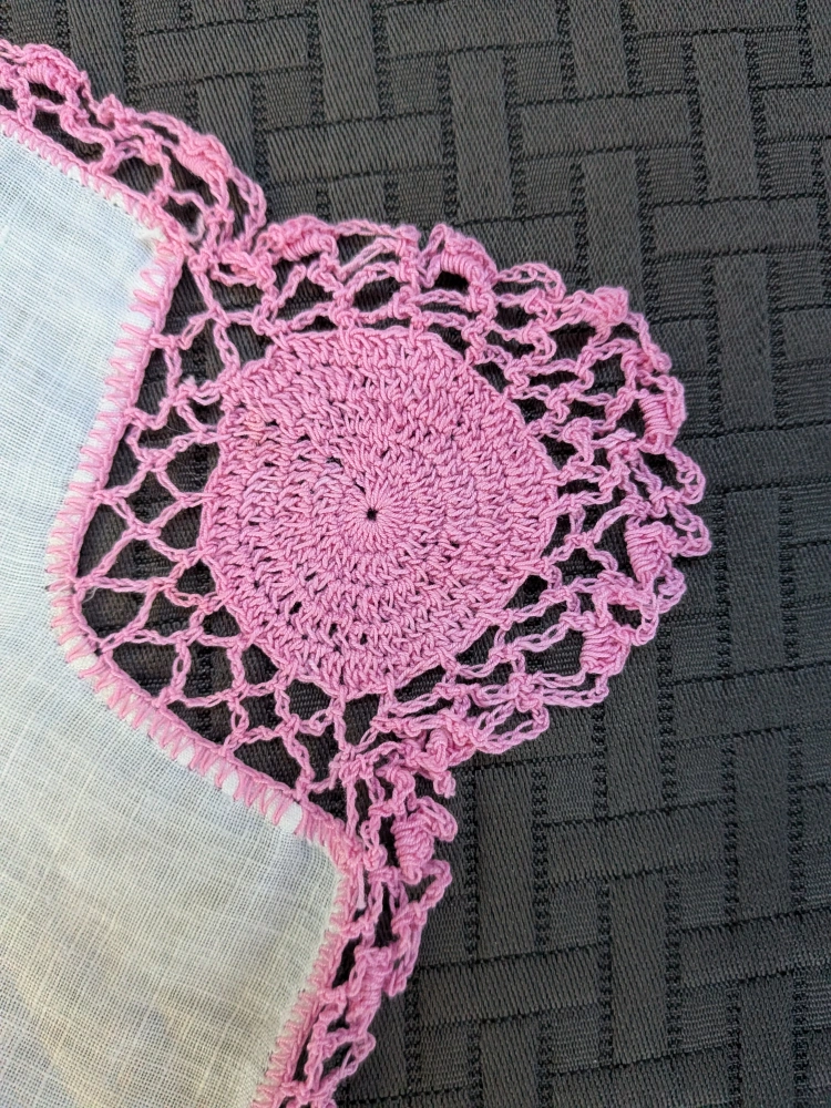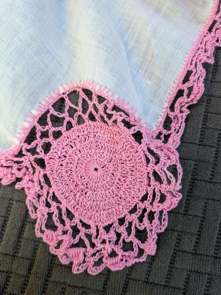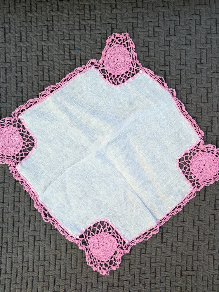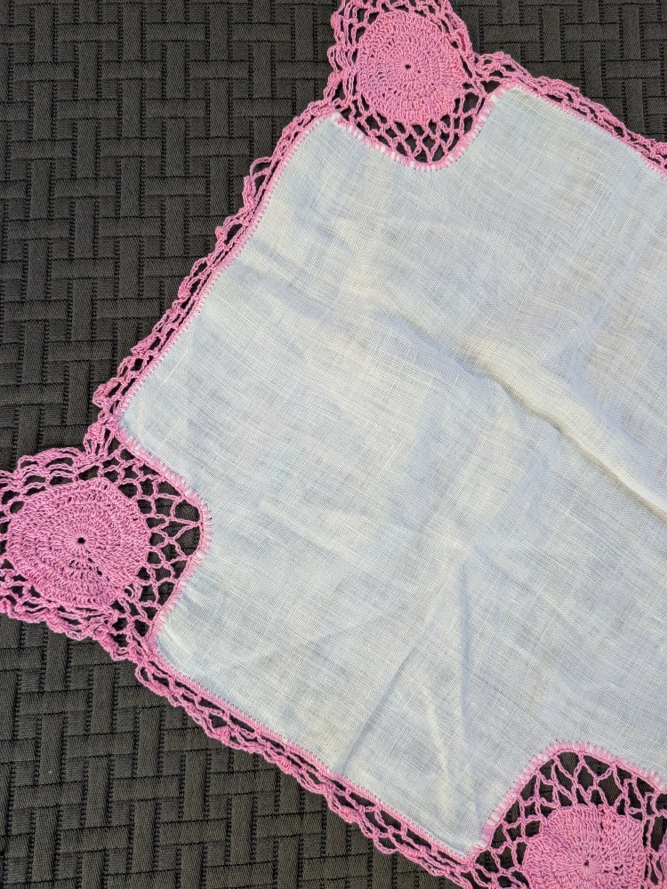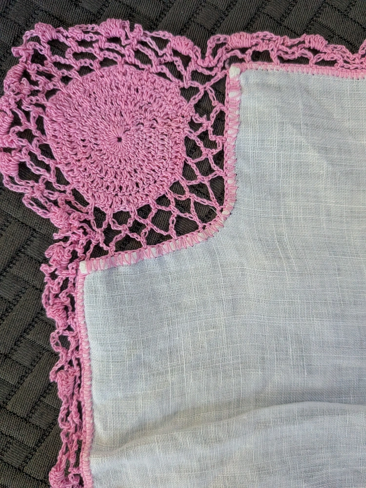 Selling a lovely vintage linen handkerchief from the 1950's era. It features a delicate white fabric with a charming pink crochet border. Perfect for adding a touch of vintage elegance to your collection or as a unique gift Good condition with no tears, holes, or stains Measures about 10.5 x 11 inches Cash only, no etransfers Location: Etobicoke. Rathburn Rd and Renforth dr. Etobicoke Olympium nearby