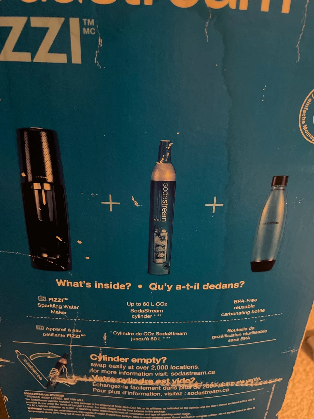 Get fizzy with this SodaStream Fizzi Sparkling Water Maker! It includes the sparkling water maker, a CO2 SodaStream cylinder (up to 60L), and a BPA-free reusable carbonating bottle. Swap your empty cylinder easily at over 2,000 locations across Canada, visit sodastream.ca for more info