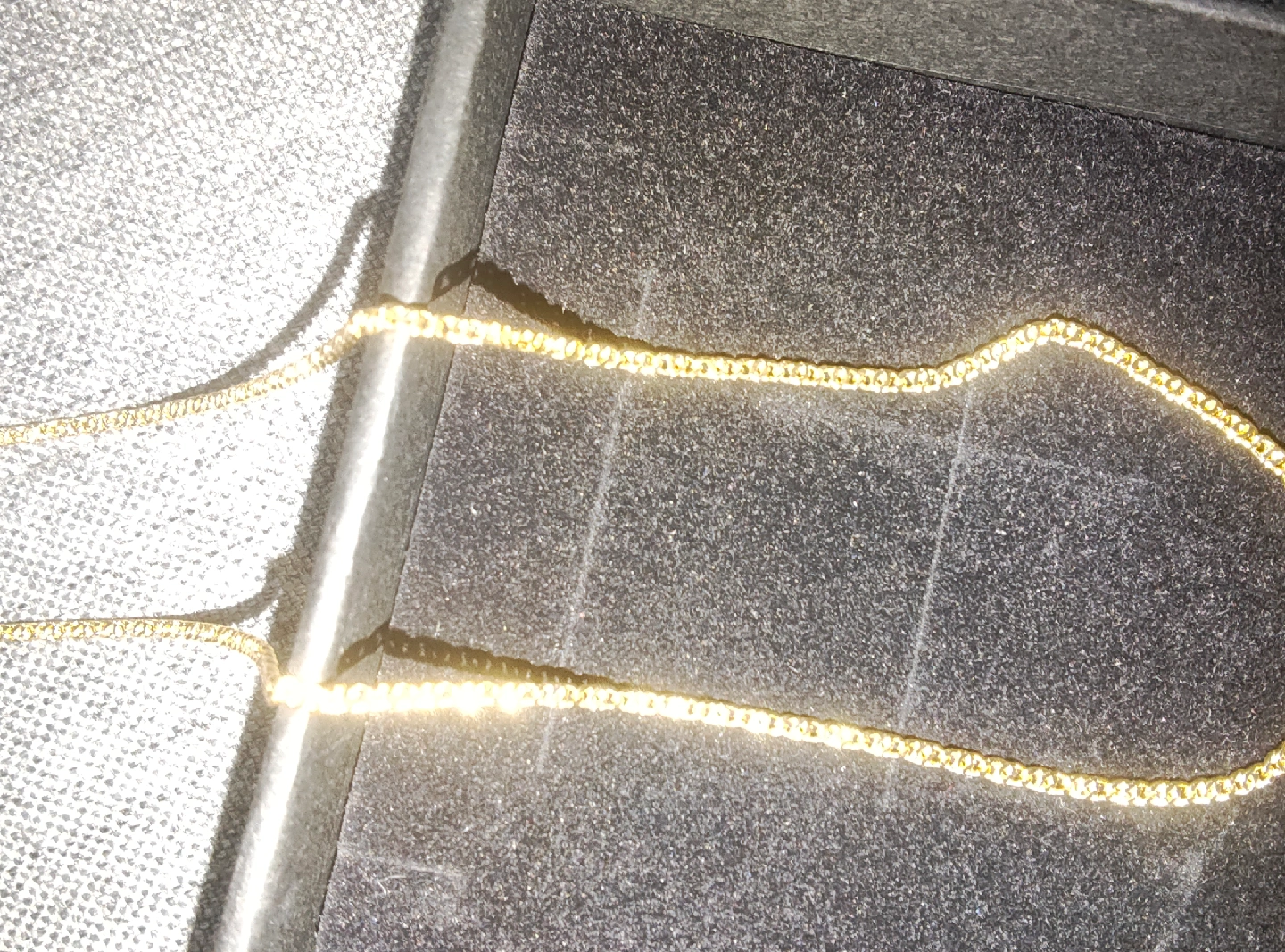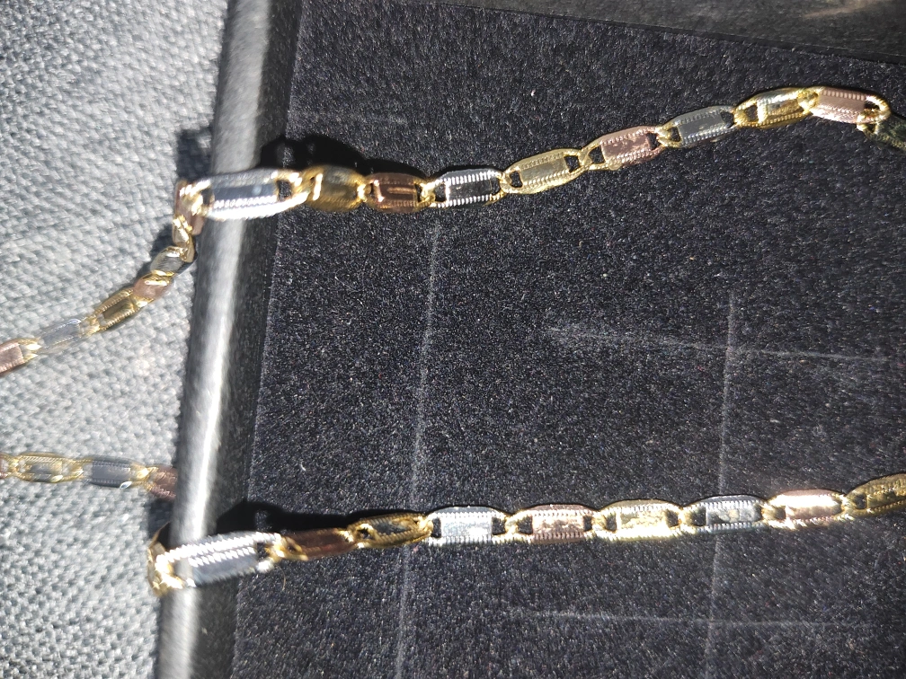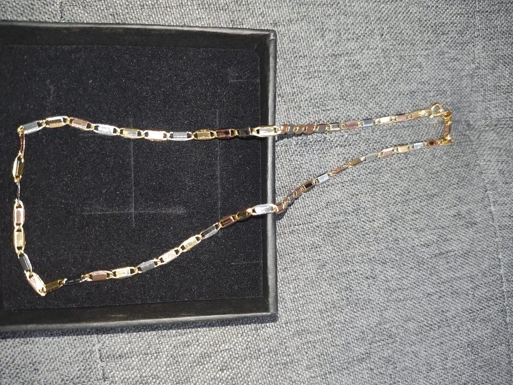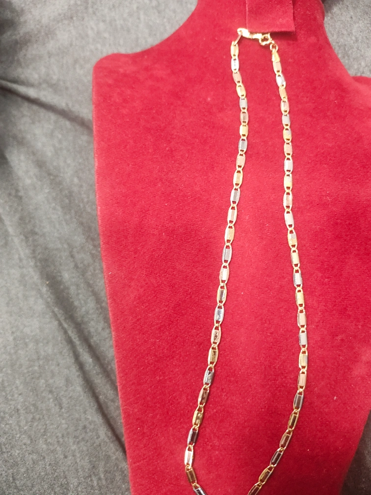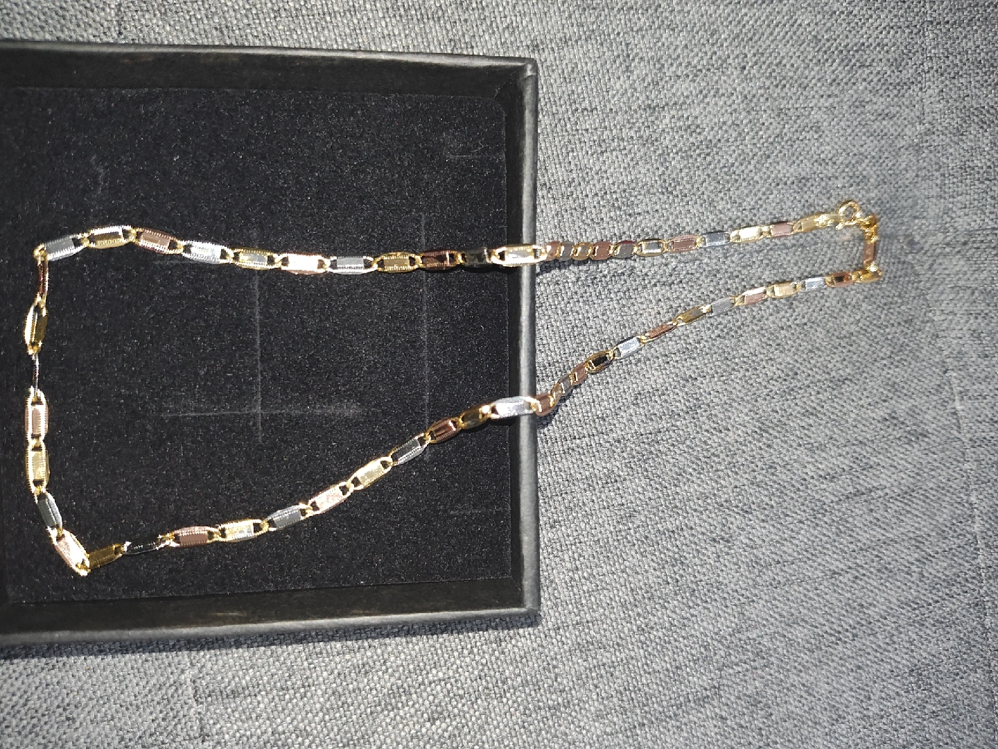 Selling a beautiful two-colour gold chain necklace. It comes in its original box. The necklace features a mix of yellow and sliver gold links, creating a unique and eye-catching design. It's in excellent condition and ready to add a touch of elegance to any outfit