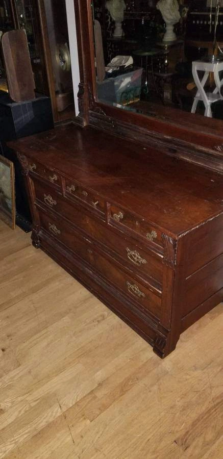 Antique 1800’s Victorian Dresser – Massive 92″ Ornate Carved Mirror E-Transfers Accepted Pick Up Anytime A commanding 19th-century dresser with an extraordinary carved mirror, crafted in rich solid hardwood (likely walnut or mahogany). Dating to the mid-to-late 1800s, this Victorian showpiece blends functionality with artful design, featuring ornate carving, a towering presence, and a warm patina developed over more than a century. Details: Dimensions: 54″ W × 24″ D × 92″ H Massive mirror with carved crest and flanking columns Three deep lower drawers with original pulls Hand-crafted joinery and decorative molding throughout Solid hardwood construction (walnut/mahogany typical for the period) Condition: Good, with light surface wear consistent with age Delivery available Why It Matters: For collectors: This is a genuine Victorian dresser with original mirror from the 1800s, valued in the $2,500–$3,000 CAD range. Its craftsmanship, ornate carving, and size make it a collector-grade acquisition. For homeowners: At 92″ tall, it makes a dramatic statement piece in a bedroom, heritage property, or upscale décor setting, offering both elegance and practicality. Antique Victorian dresser, carved mirror furniture, 19th-century dresser, ornate antique, collector furniture, heritage décor, walnut dresser, museum quality Price: $2,795 CAD