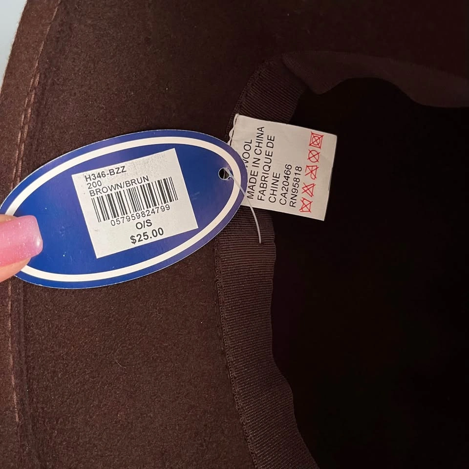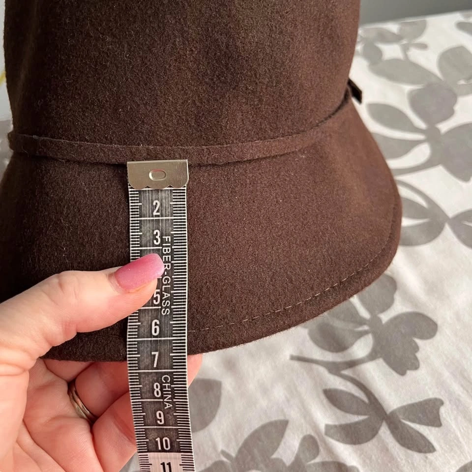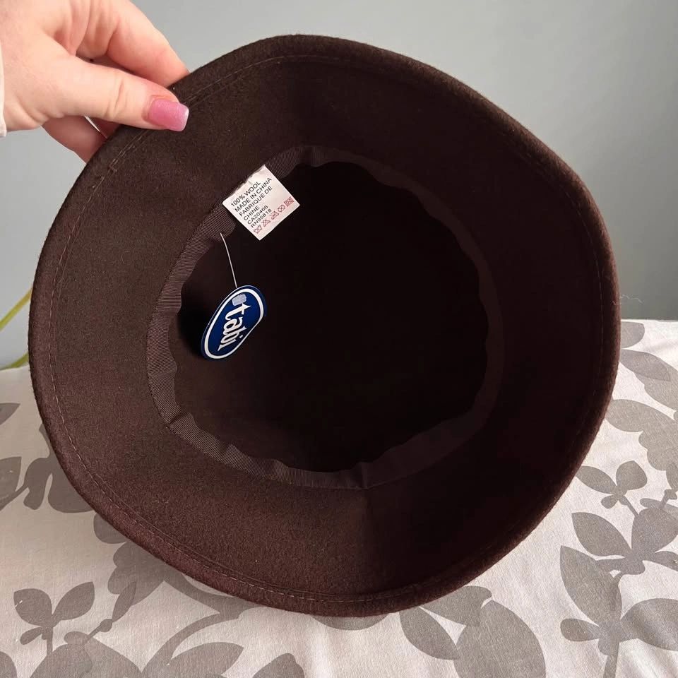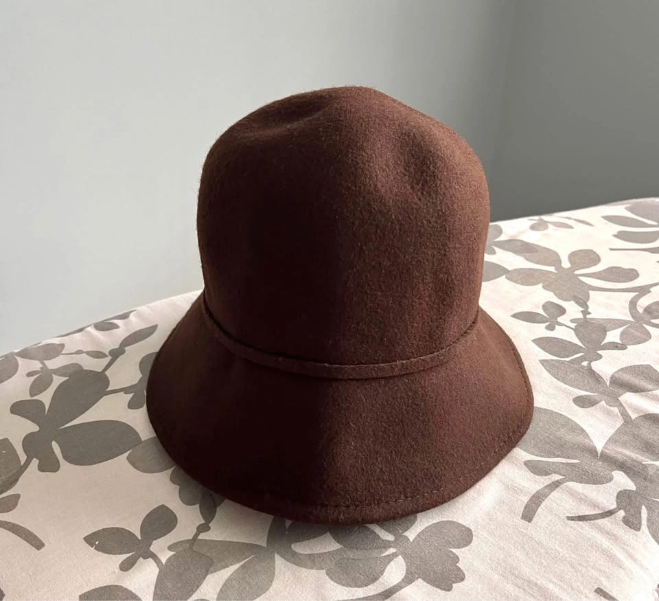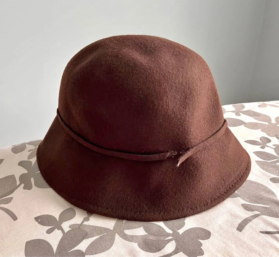 This elegant rich chocolate brown hat is a perfect accessory for any occasion. Its sleek design adds a touch of sophistication to your outfit. 100% Wool and Classic black with leather band detail. - Grosgrain ribbon band, no lining. - Simplistic design makes it easily dressed up or down. - O/S In great condition, however the band is coming loose as shown. Can be glued or add a broach or flower to cover. Porch pick up west Maple Ridge.