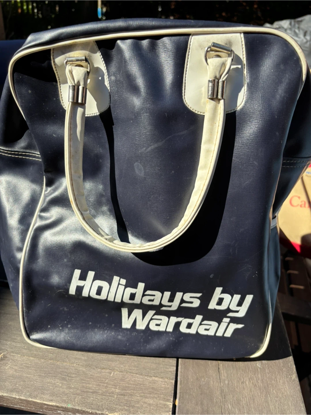 Selling a vintage "Holidays by Wardair" travel bag. It's a cool retro piece with a navy blue and white colour scheme. It shows some signs of wear, but it's still a functional and stylish bag for travel or storage