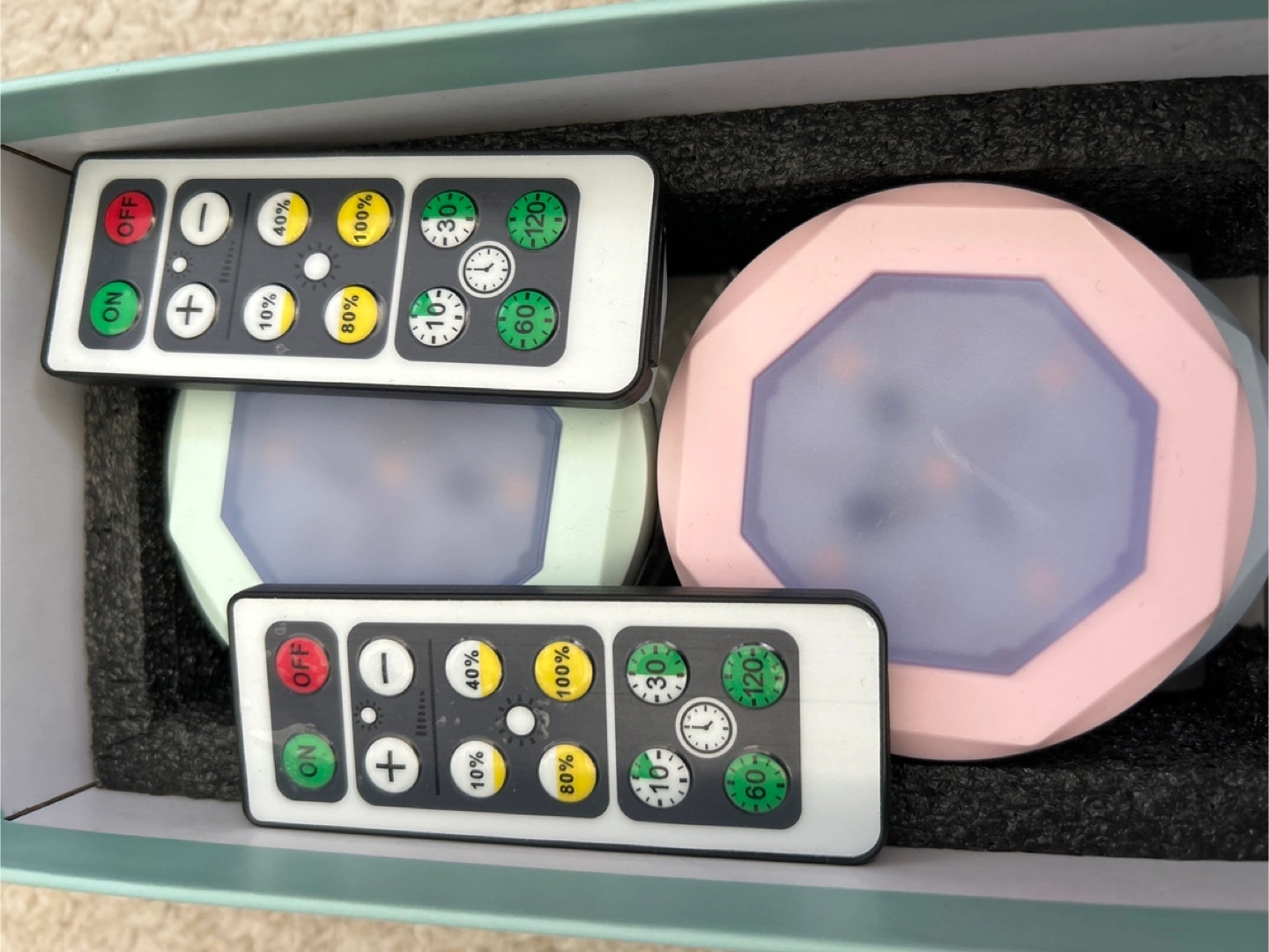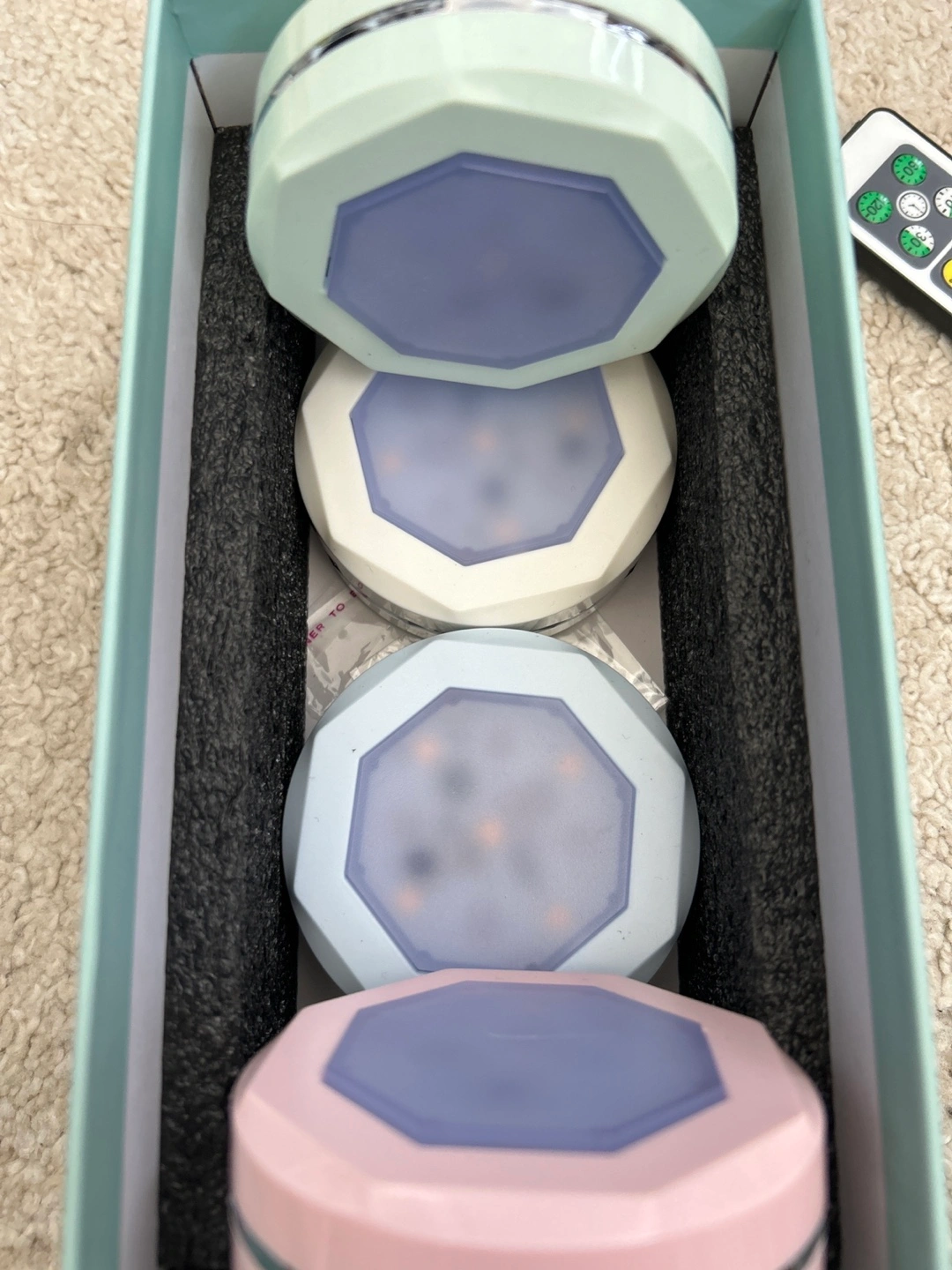$8 ea, 2 for $15 and 4 in total for $25 Add a pop of colour and convenient lighting to your space with this set of four LED puck lights! They come in a variety of pastel shades and include a handy remote for easy control. Perfect for closets, shelves, or under cabinets. The box is included!