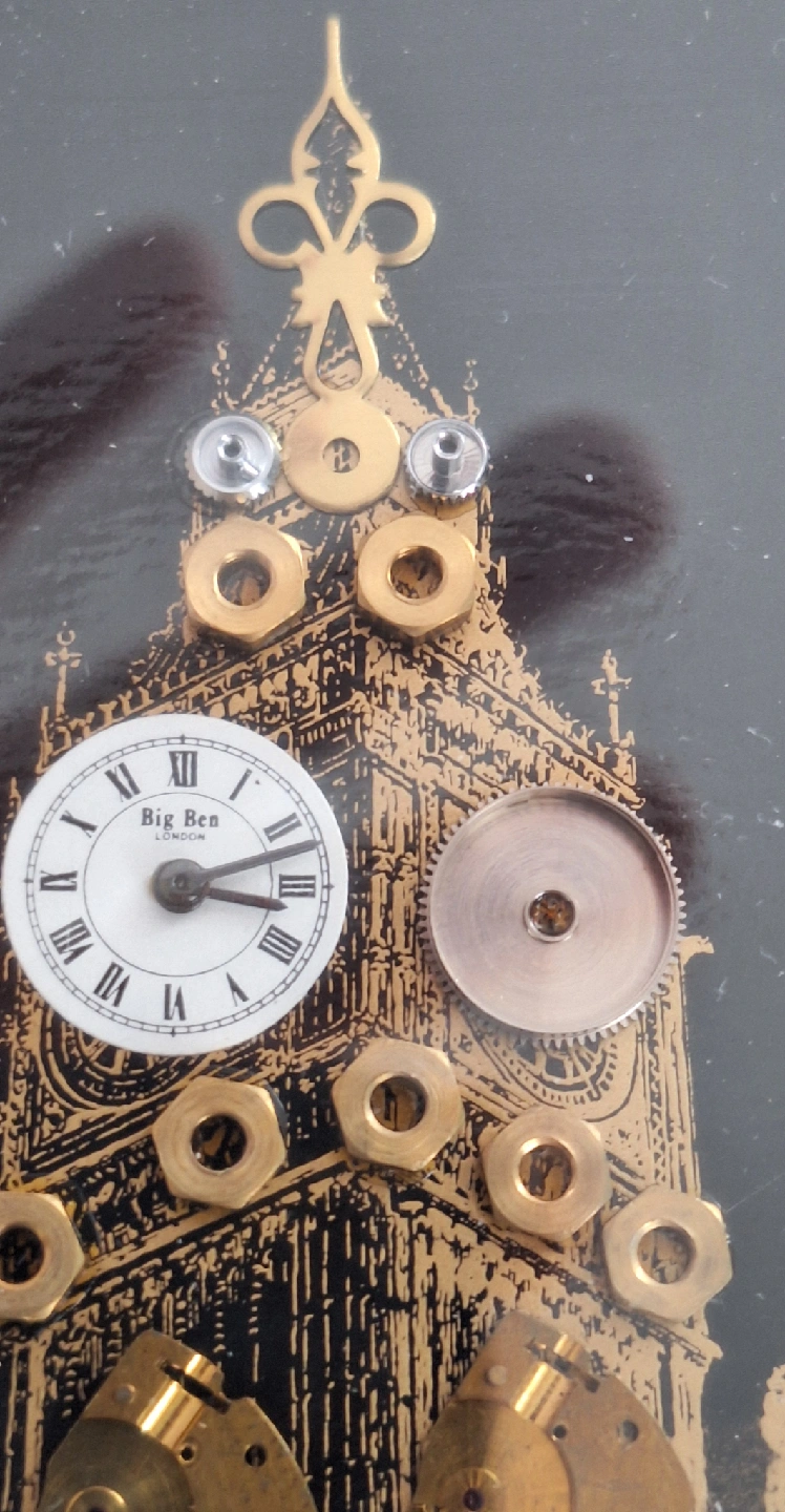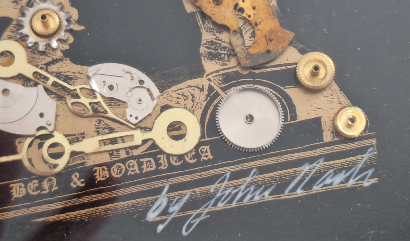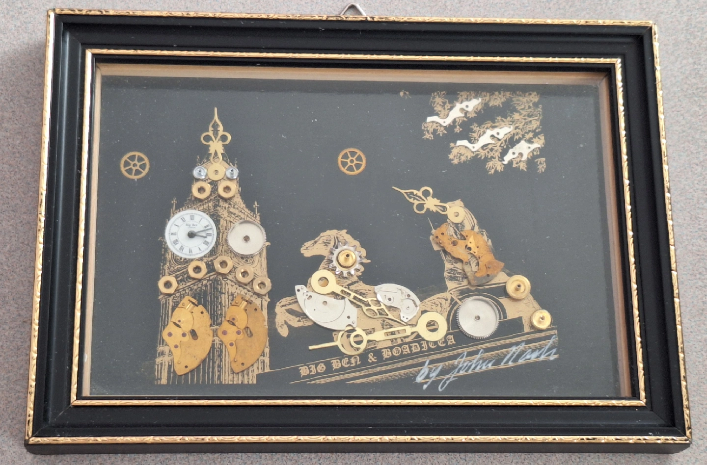 Unique framed artwork featuring Big Ben and Boadicea, crafted from clockwork parts and signed by John Nash. Frame size 7 x 5 inches
