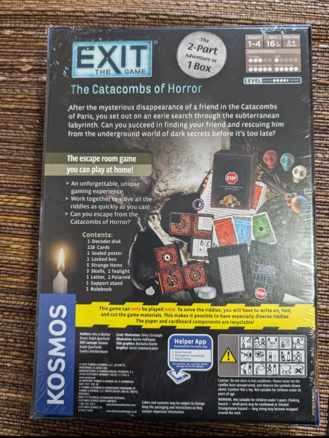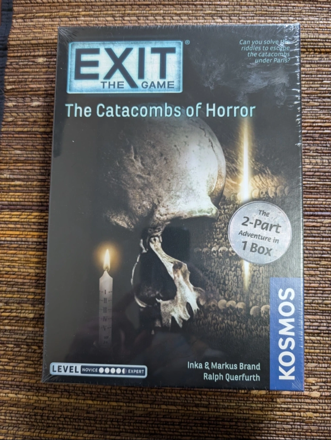 Selling a brand new, still-sealed copy of EXIT The Game: The Catacombs of Horror! This is a 2-part adventure in one box. Can you solve the riddles to escape the catacombs under Paris? The game is designed for 1-4 players, ages 16 and up, and is rated as an expert-level challenge! Includes all components: decoder disk, cards, sealed poster, locked box, strange items, skulls, tealight, letter, polaroid, support stand, and rulebook