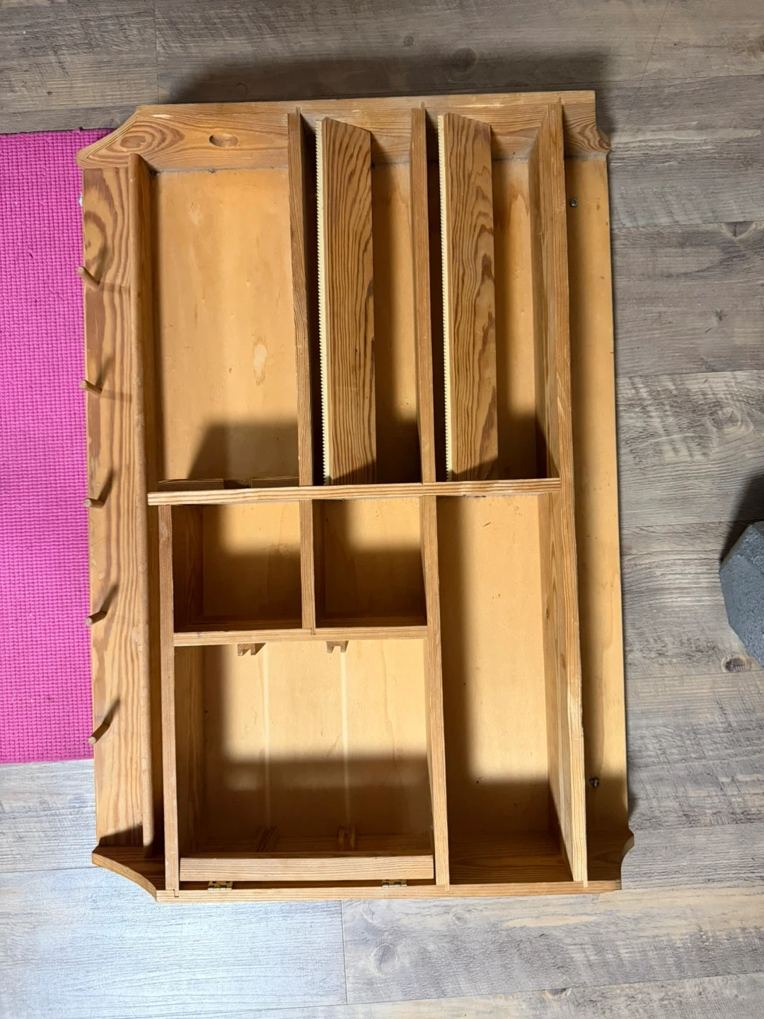 Selling a wooden wall organizer. It has several compartments and pegs for storage. This would be great for organizing mail, keys, or small items in your entryway or kitchen