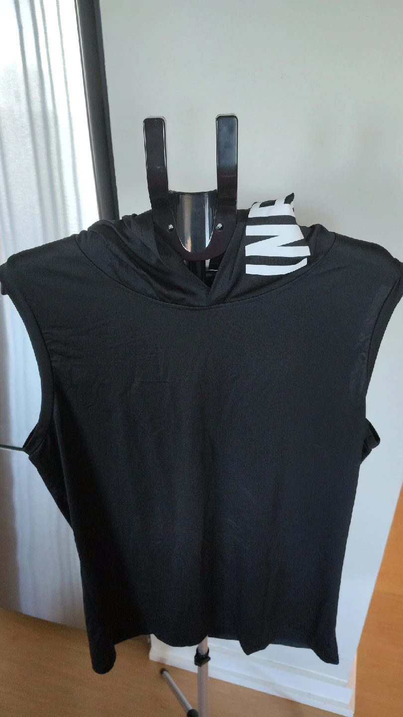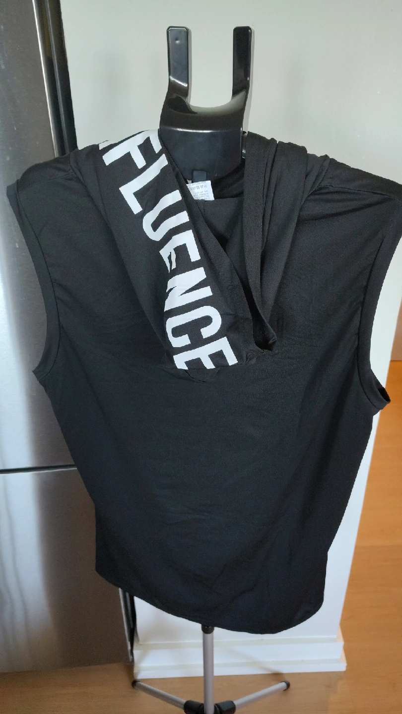 Here's a black sleeveless hoodie with the word "Influence" printed on the hood. NEW