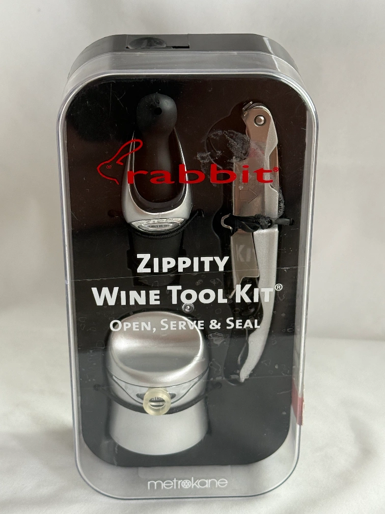 Selling a brand new Rabbit Zippity Wine Tool Kit! This kit has everything you need to open, serve, and seal your wine. It includes: - A fast 2-step corkscrew - A foil cutter that retracts automatically - A Teflon-coated spiral - A pourer/stopper with a velvet finish - A wine/champagne sealer to keep your bubbly fresh Comes in the original packaging