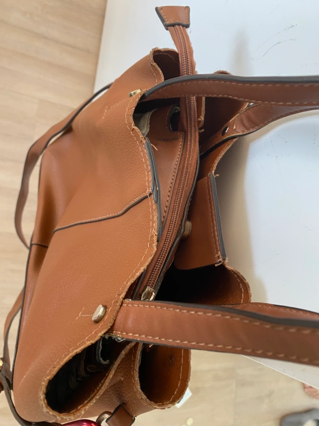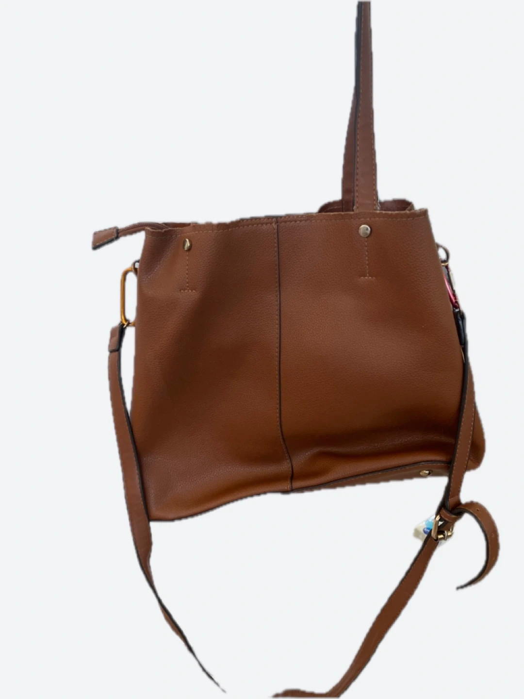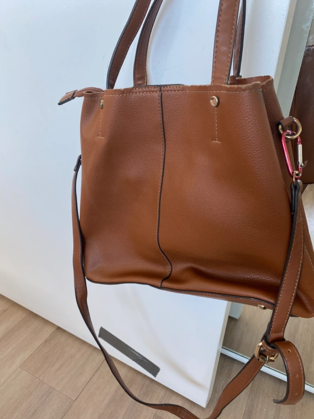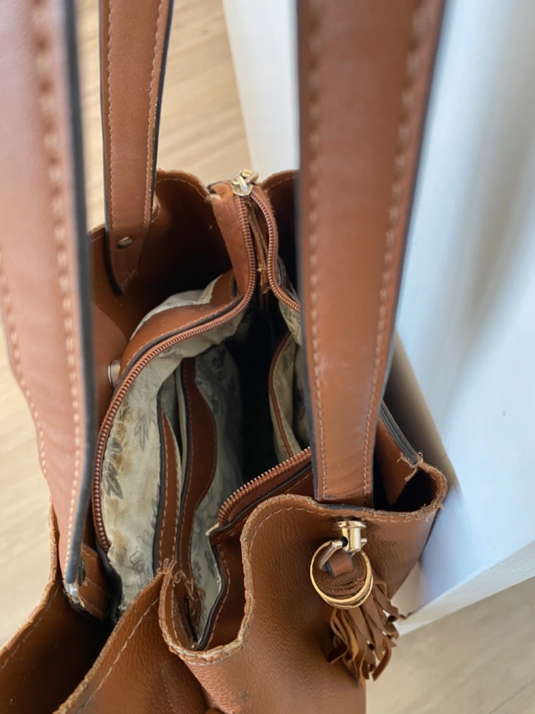 A brown tote bag with a shoulder strap. It has a zipper and some signs of wear.