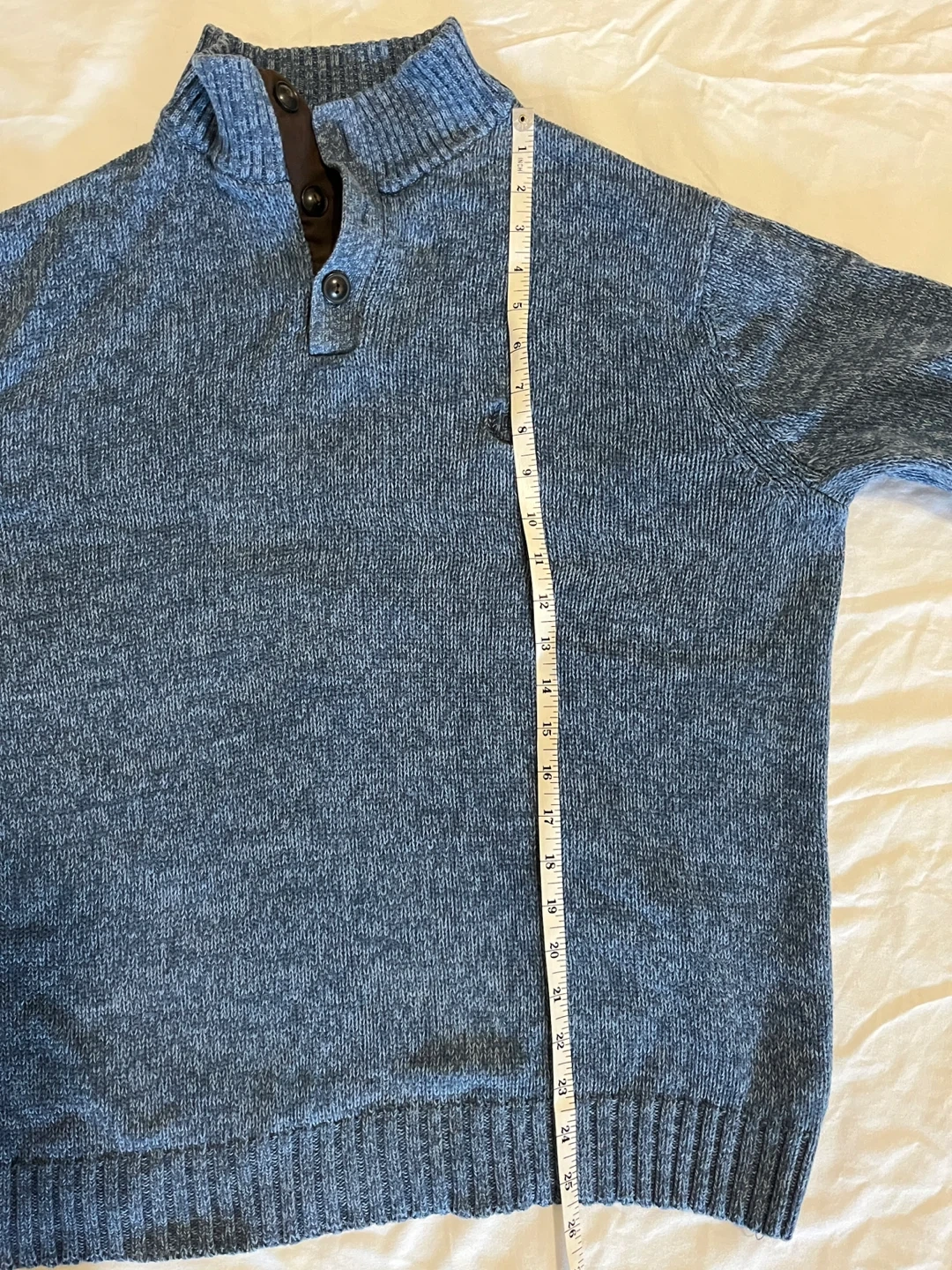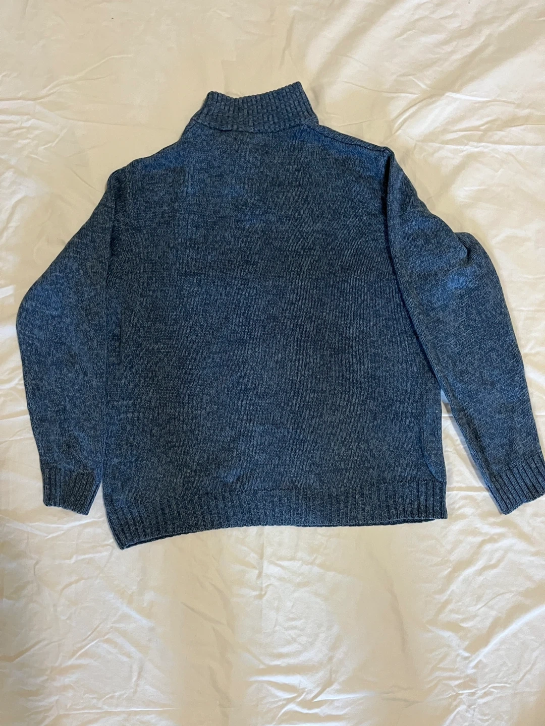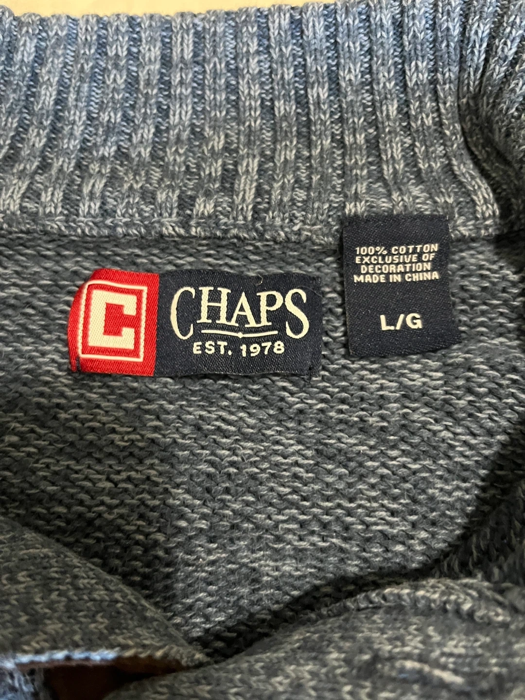Chaps Ralph Lauren sweater, men’s size large, in marled ‘Wave Twist’ blue. Like new condition. Quarter mock neck with three buttons, ribbed hem and cuffs, embroidered chest logo, and faux suede elbow patches. Classic style. Measurements (flat): Pit to pit 24” | Length 25.5” | Sleeve 24” | Bottom 20.5” Pickup in Oshawa - Harmony/Rossland area