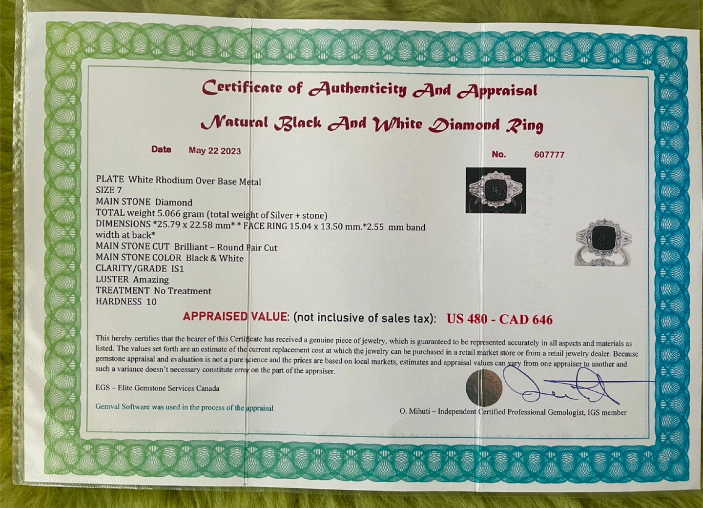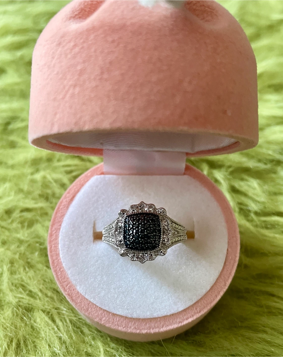 Main stone Diamond Black & White. Plated white Rhodium over base metal. Size 7 Total weight of Silver & stone about 5 gr. Certificate of Authenticity and Appraisal . Jewelry . Fashion.