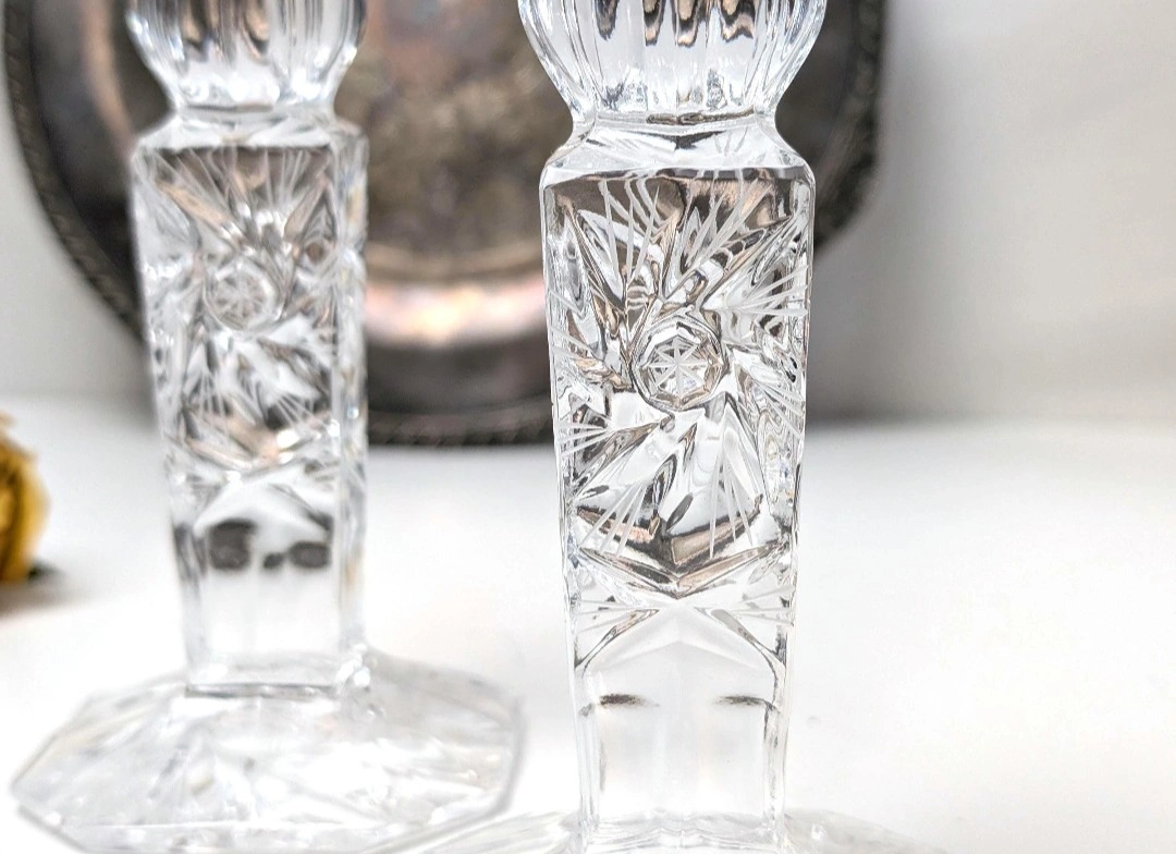 Sparkling cut crystal candlestick holders. Classic pinwheel design. Likely Czechoslovakian crystal. Square stem and base. Each approximately measures 6.25 inches in height. Good vintage condition. Very elegant. Very giftable. π PICK UP TOWNLINE HWY 2 AREA π CASH is preferred please π Thanks for looking π©΅