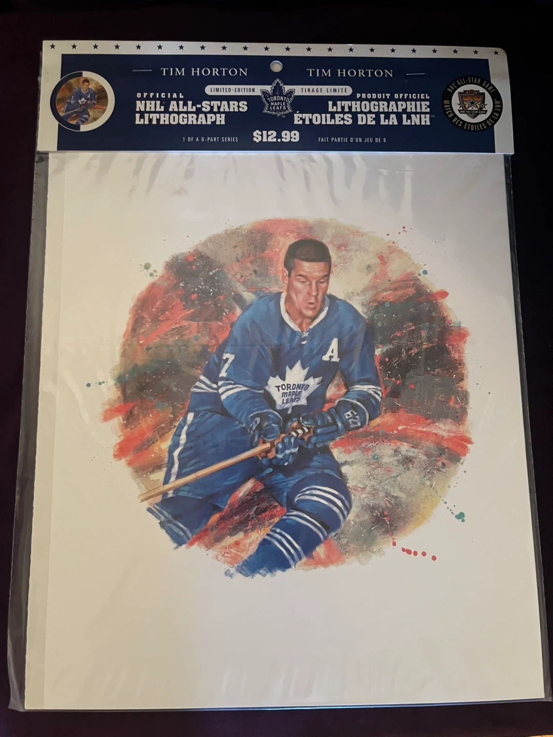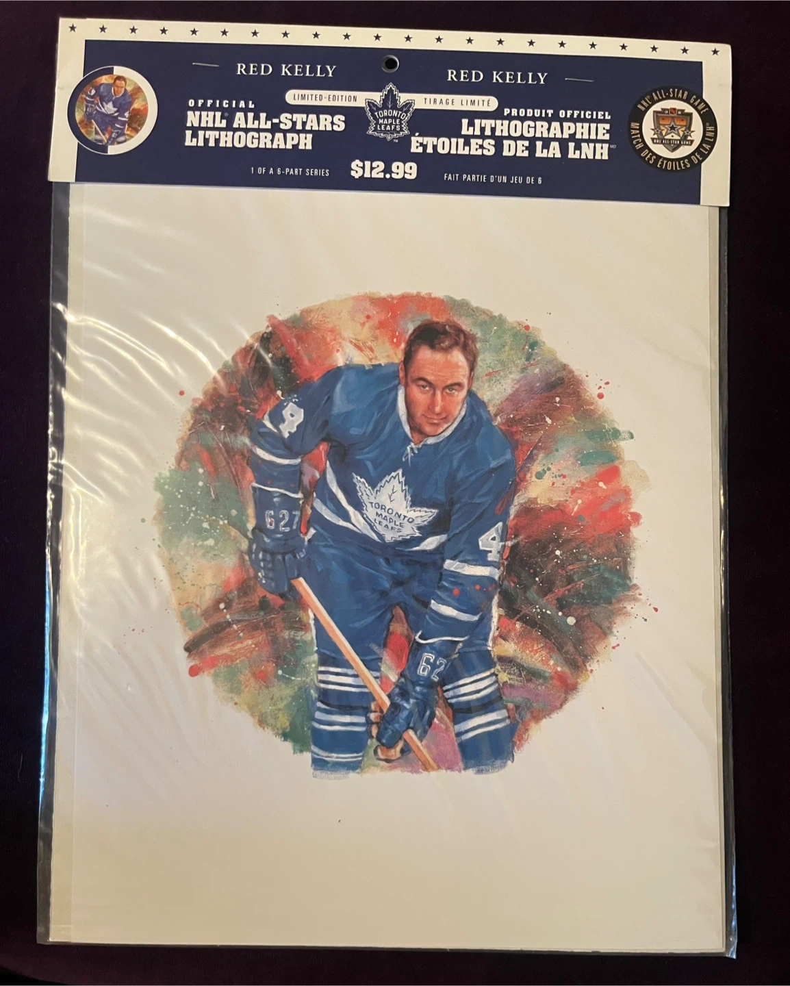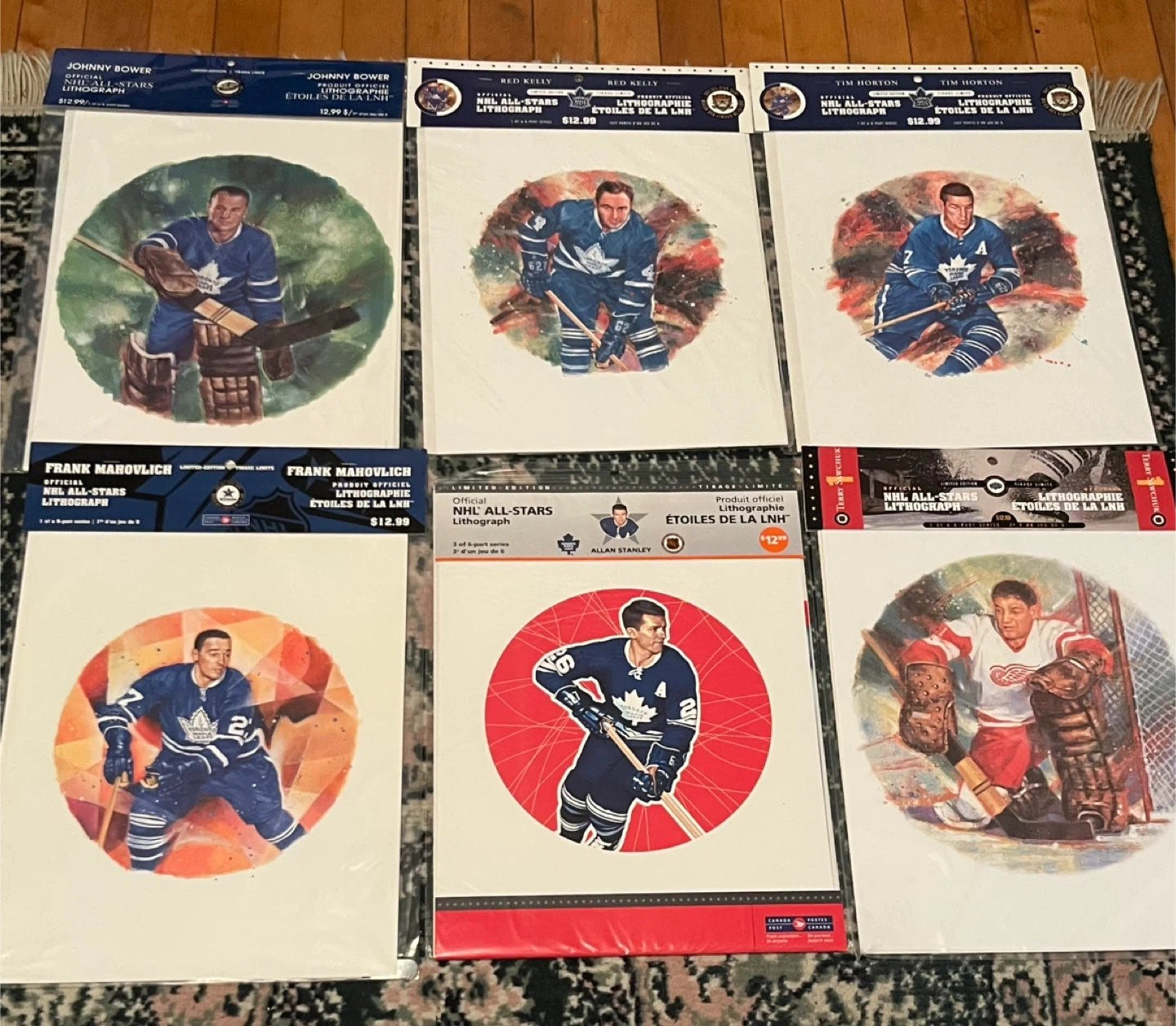 Each lithograph features a prominent NHL All-Star player, including Johnny Bower, 2004 Red Kelly, 2002 Tim Horton, 2002 Frank Mahovlich, 2003 Allan Stanley, 2005 and Terry Sawchuk.2001 They all also include official postage stamps featuring the same images. Cash only please