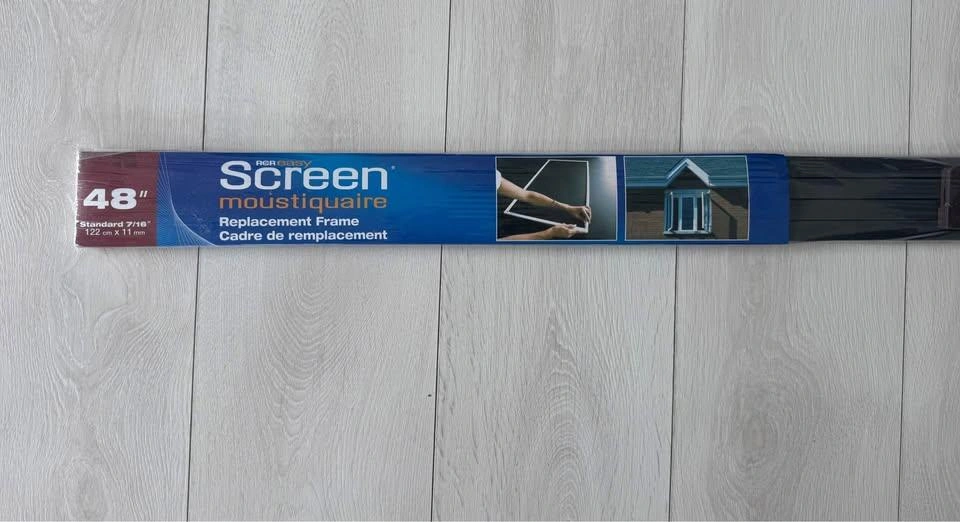 Brand new screen replacement from Rona selling because I don’t have the receipt and got the wrong size. Brand new cost $24.85 after taxes but I’m selling it for 10$ Cash https://www.rona.ca/en/product/easy-screen-screen-bar-sf48716bk-0412725 Description 48 in. x 7/16 in. Complete frame kits including sides and frame corners. Made of aluminum. Brown. -Frame can be cut to required length -Diameter of 0.4375-in -Complete brown 48-in frame, including sides and frame corners -7/16-in frame size -Replace bent or old and dirty frames -Sizes to fit standard windows and doors CASH and Pick Up only Location: Parklawn and Lake Shore Blvd W, Etobicoke
