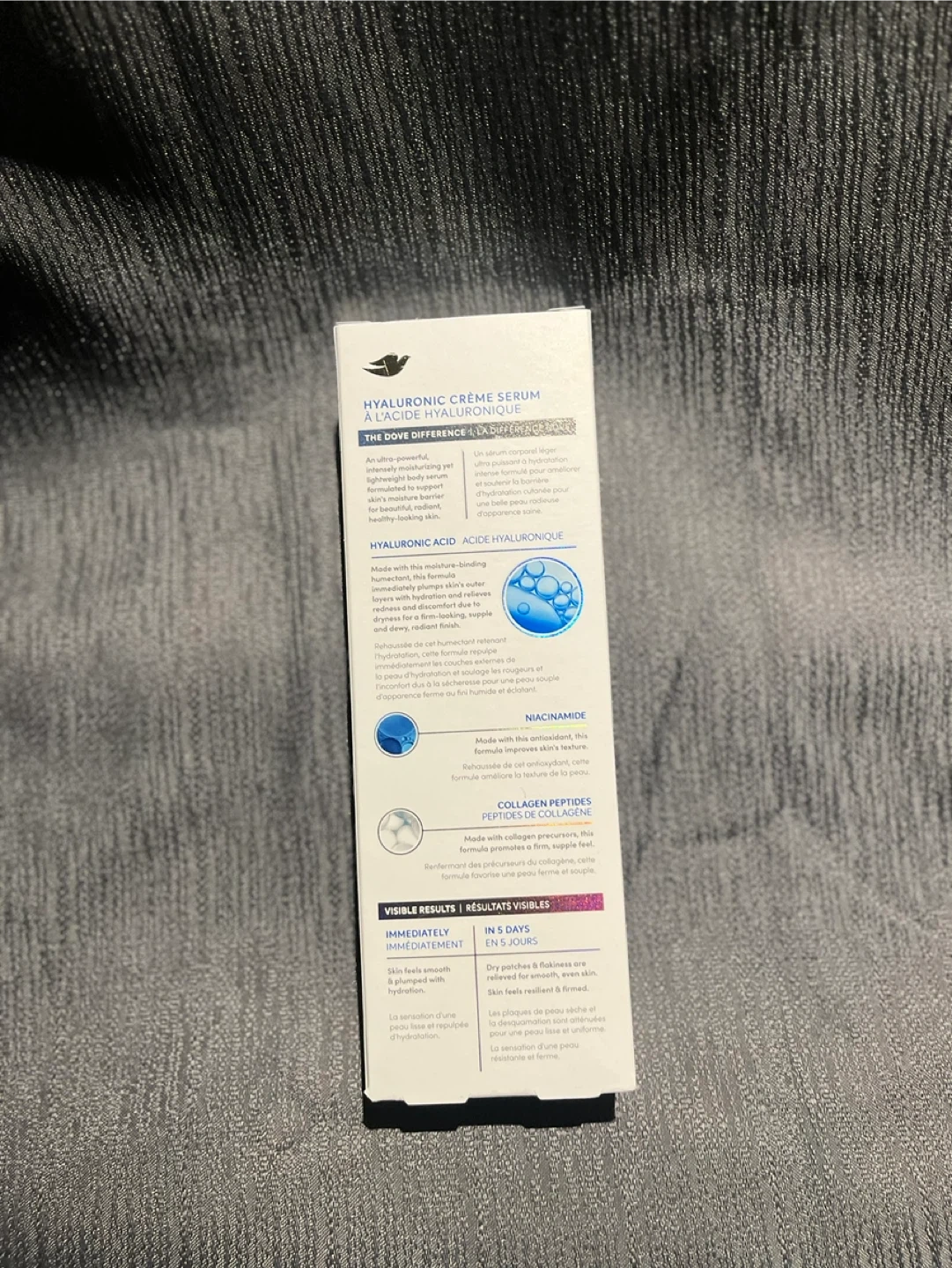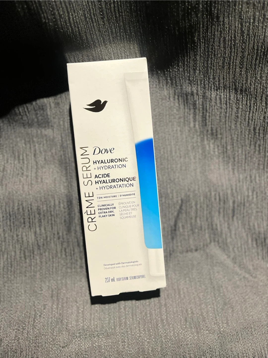 Selling a Dove Hyaluronic + Hydration Crème Serum. It provides 72 hours of moisture and hydration. It's clinically proven for extra dry, flaky skin. It also contains collagen peptides and niacinamide to visibly reduce wrinkles in 5 days