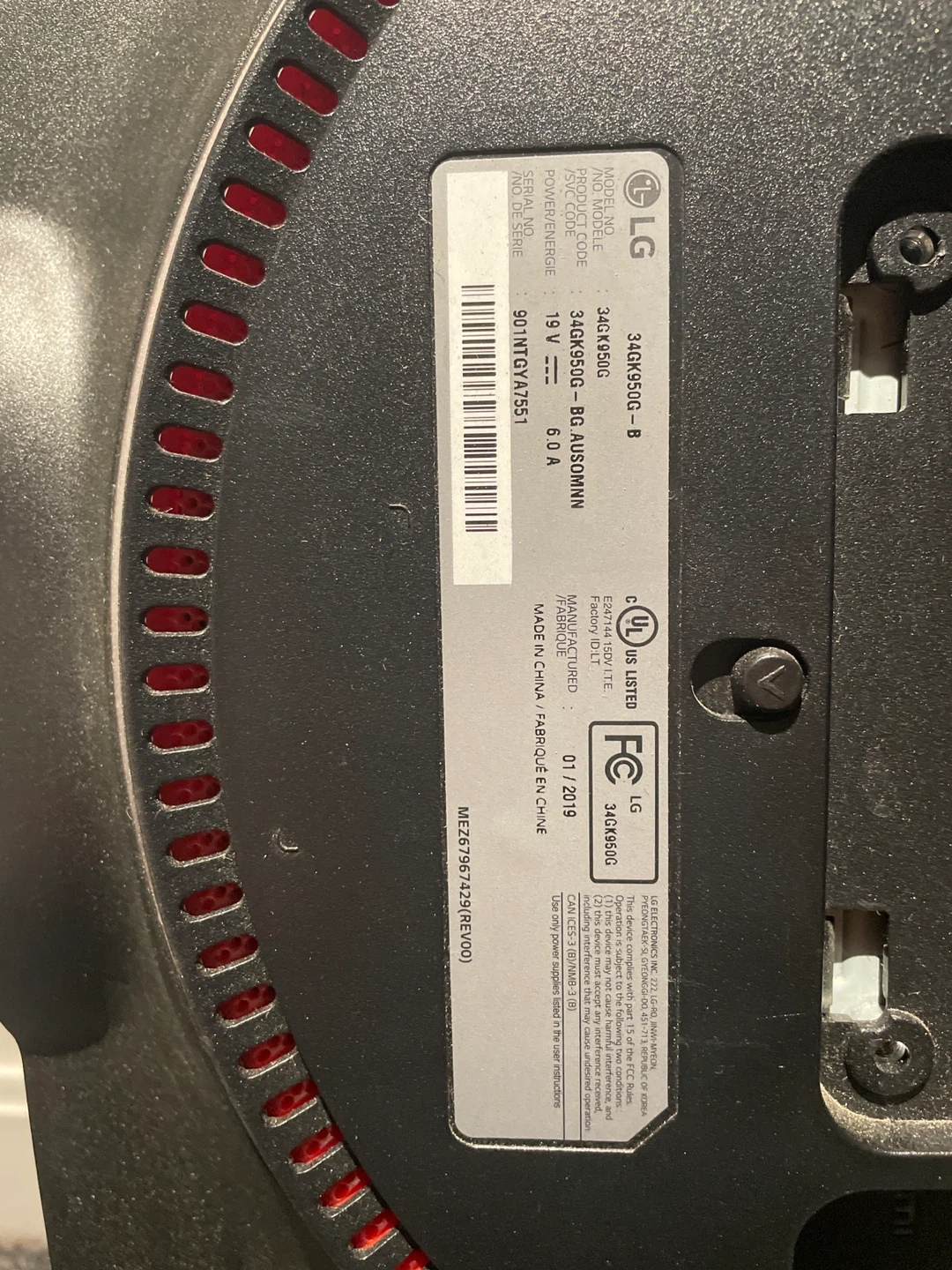 Broken during the transit, sell parts. New power adaptor for $30 and compatible monitor holder for $30. Selling an LG 34GK950G-B monitor. The model number is 34GK950G. It requires 19V power.