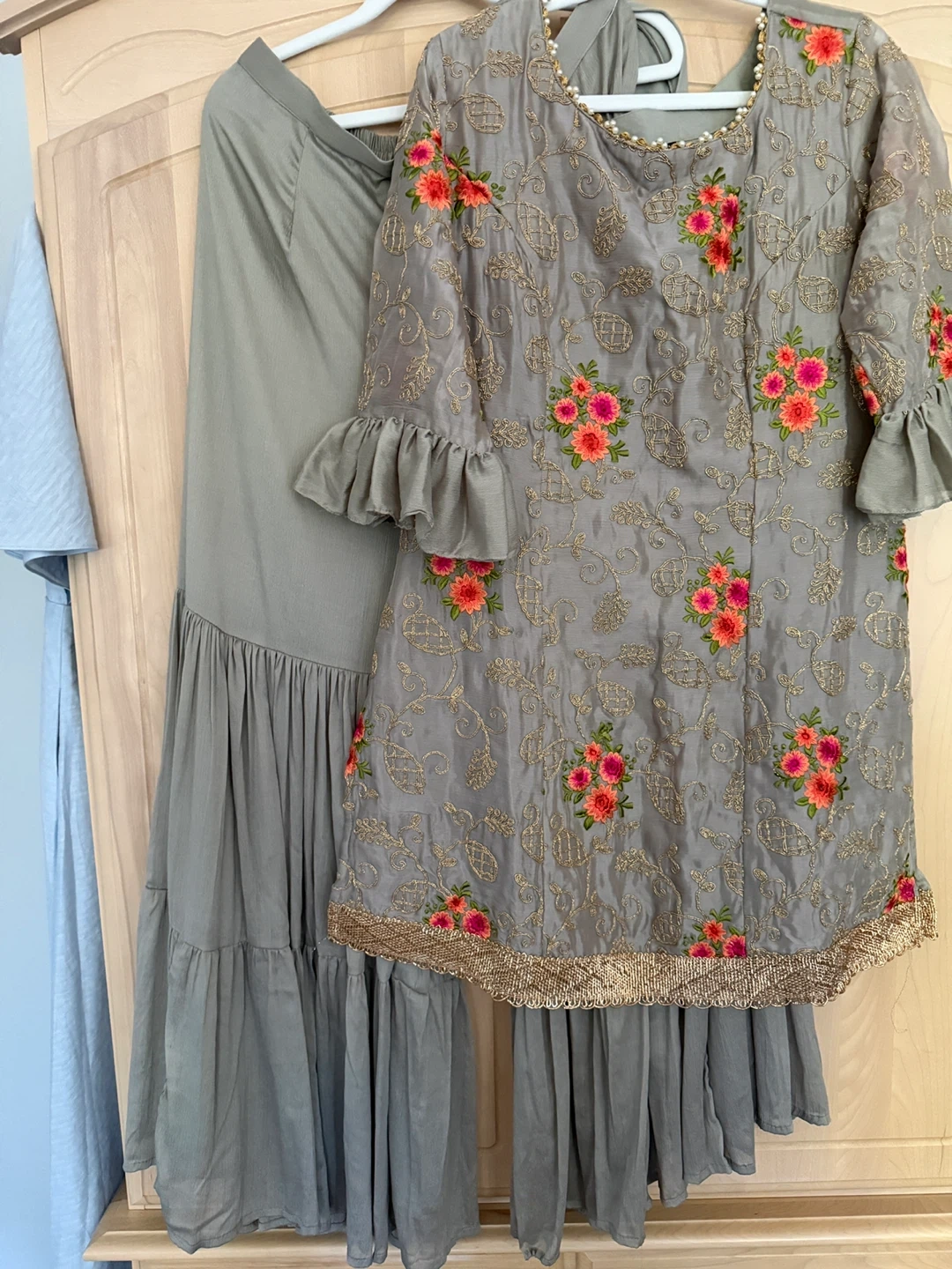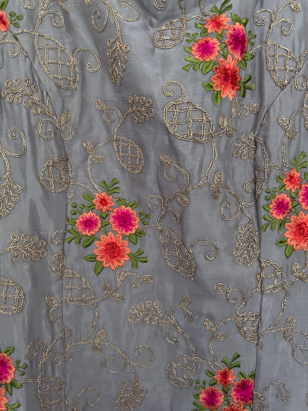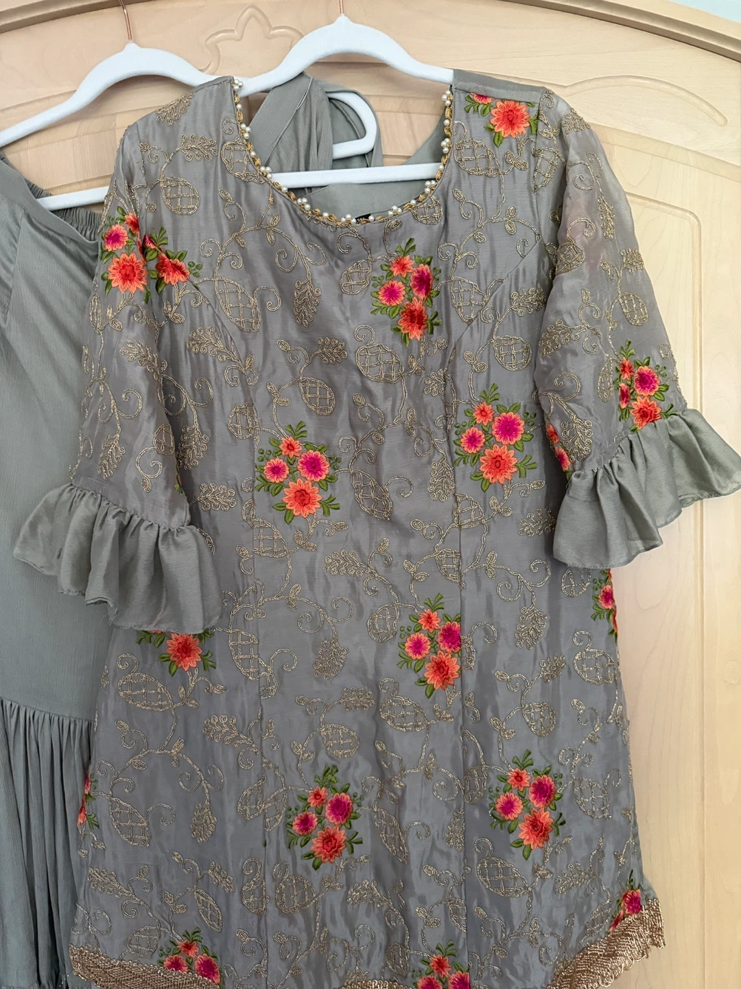Selling a lovely grey dress with floral embroidery! It features a unique design and is in great condition. Perfect for a special occasion or a stylish everyday look