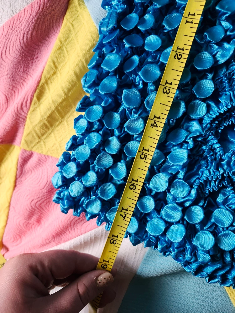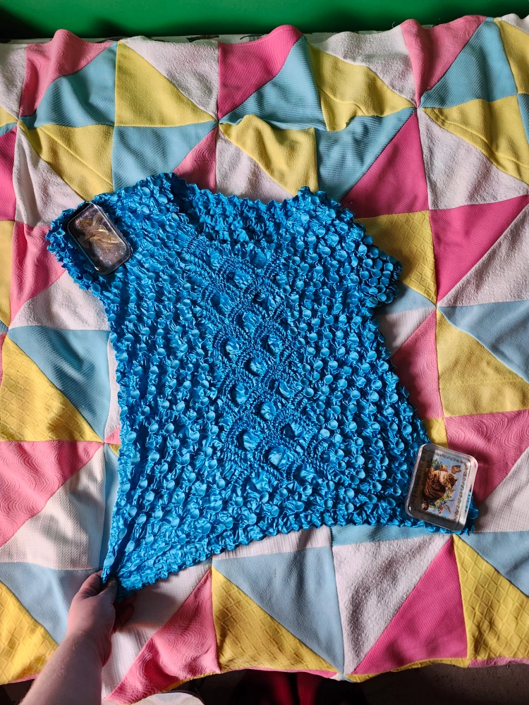 Blue popcorn top with a unique, textured design super cute y2k staple blue popcorn top!! lots and lots of stretch, the most versatile shirt you will own no size or brand labels, this item can fit a large range. at its widest the measurments are: pit to pit flat is 23in, and top to bottom is just over 26in at its smallest: pit to pit flat is 13in, top to bottom is just over 17.5in item is in good used condition with no flaws or stains that I noticed