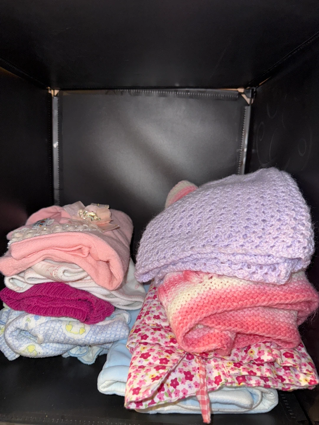 A cute bundle of baby girl clothes! There are various items in different shades of pink, purple, and blue. Perfect for a newborn or young baby This section is for girls, from age 1 to 3 years old. Prices range from $3 to $8. Soft and warm outfits, including pajamas
