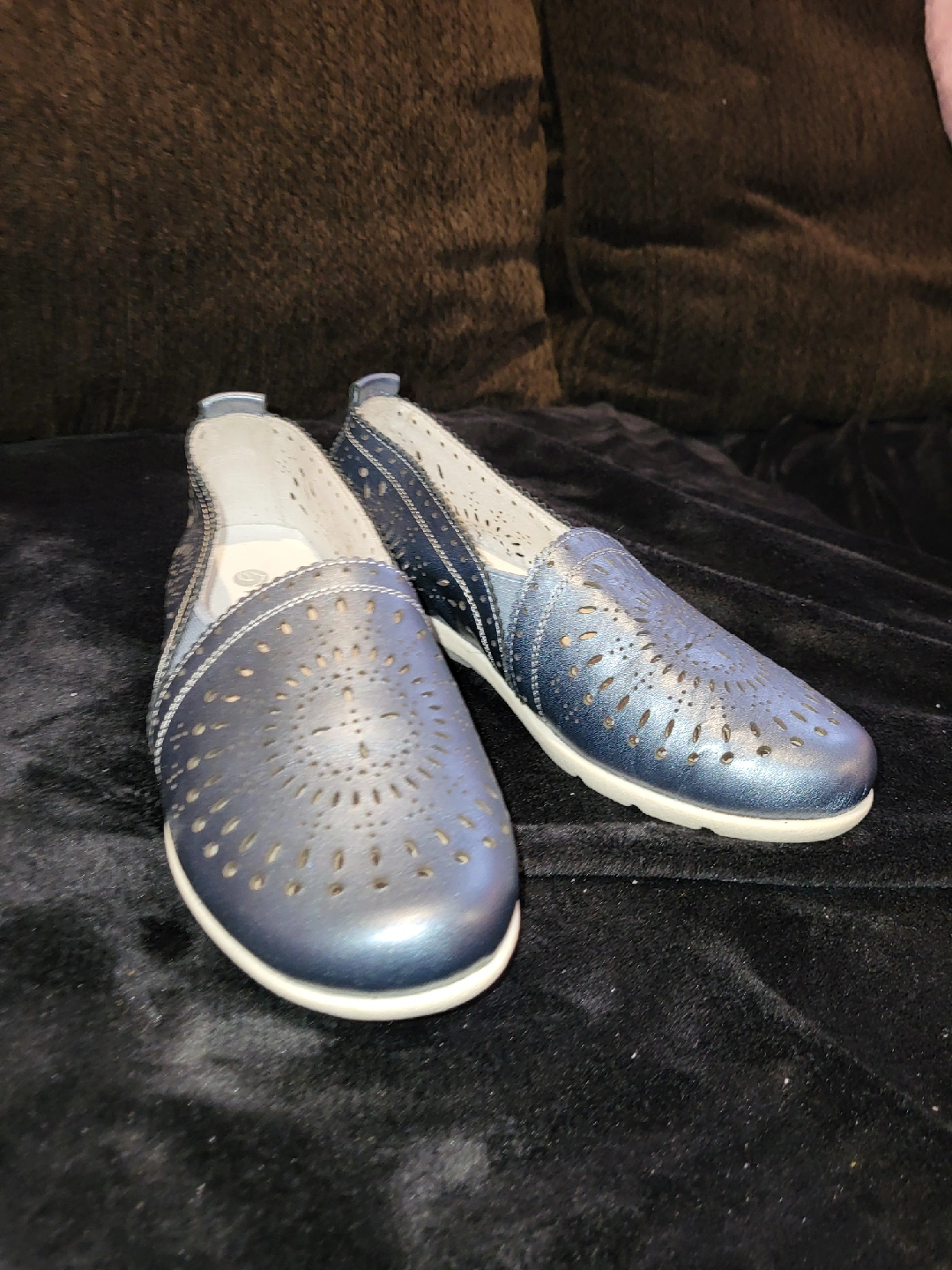 These flats are a lovely metallic blue colour and feature a stylish laser-cut design. They are made of leather and are a women's size 6. They are in good condition and ready for a new home