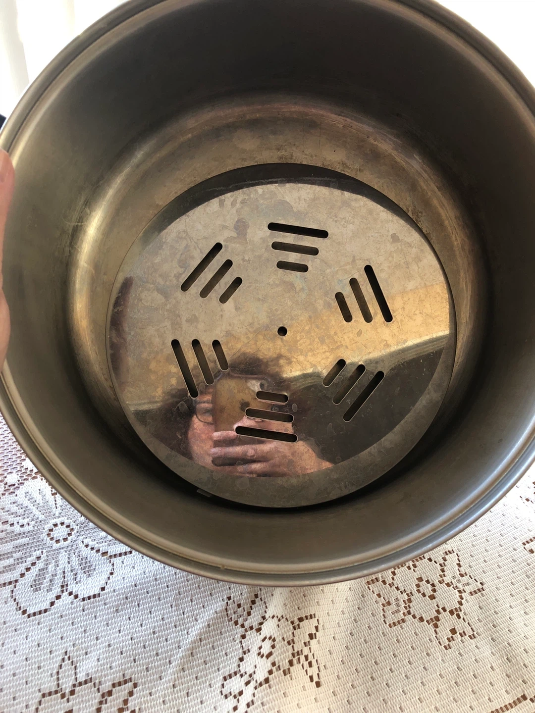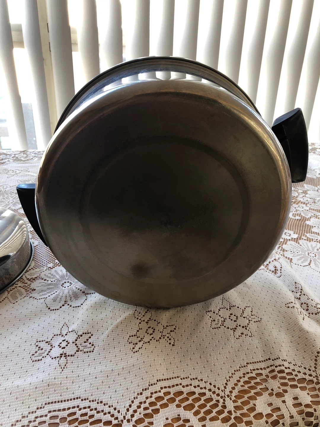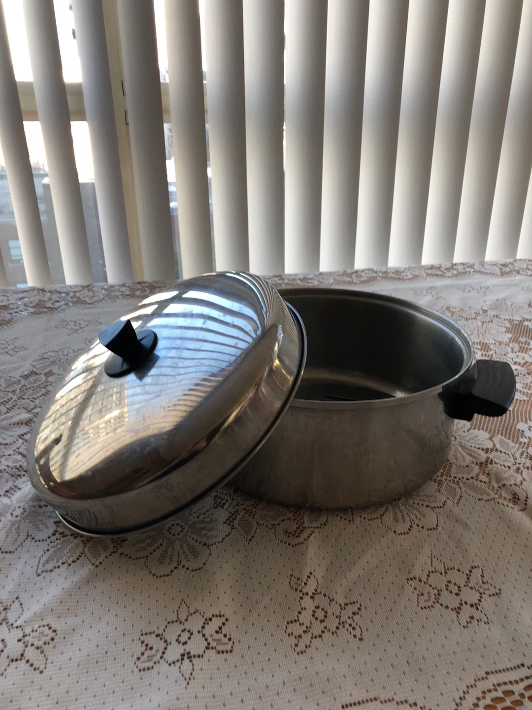 Selling a stainless steel stock pot with a lid. It's in good condition and ready for your next culinary adventure! It also comes with a steamer insert, great for veggies or dumplings