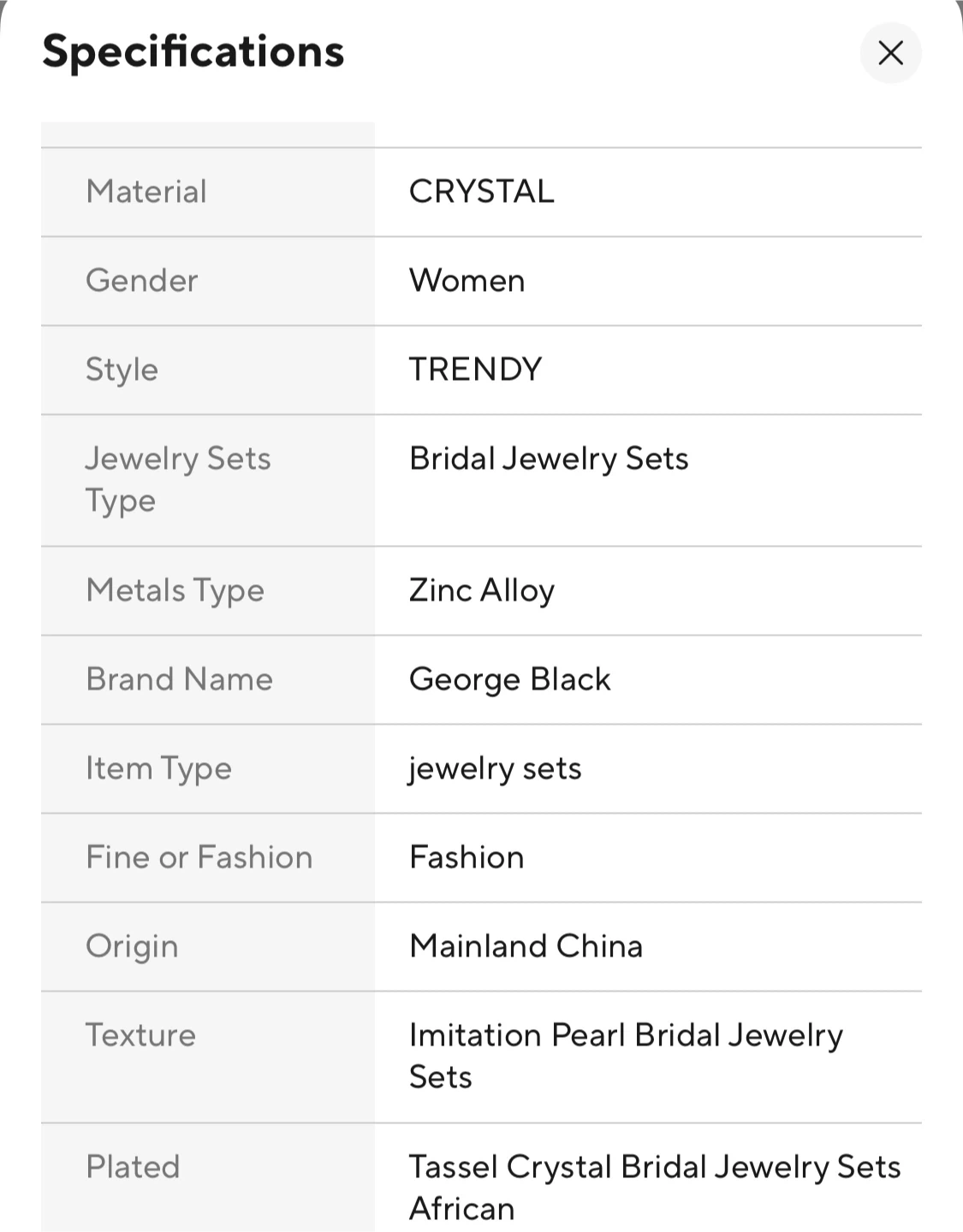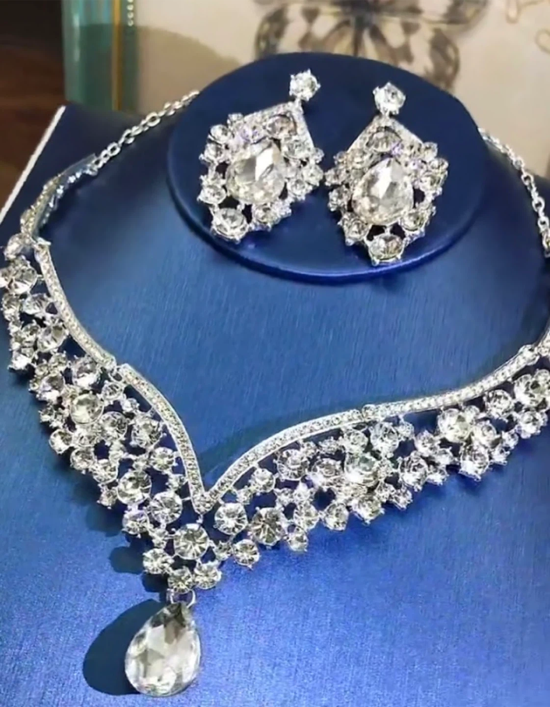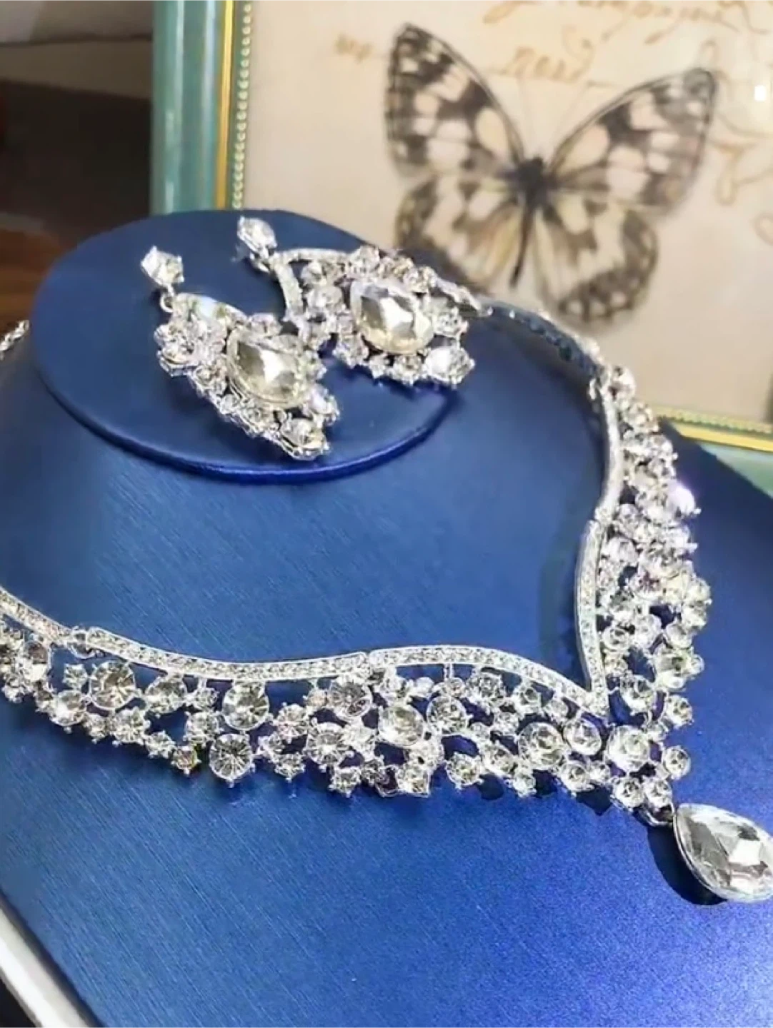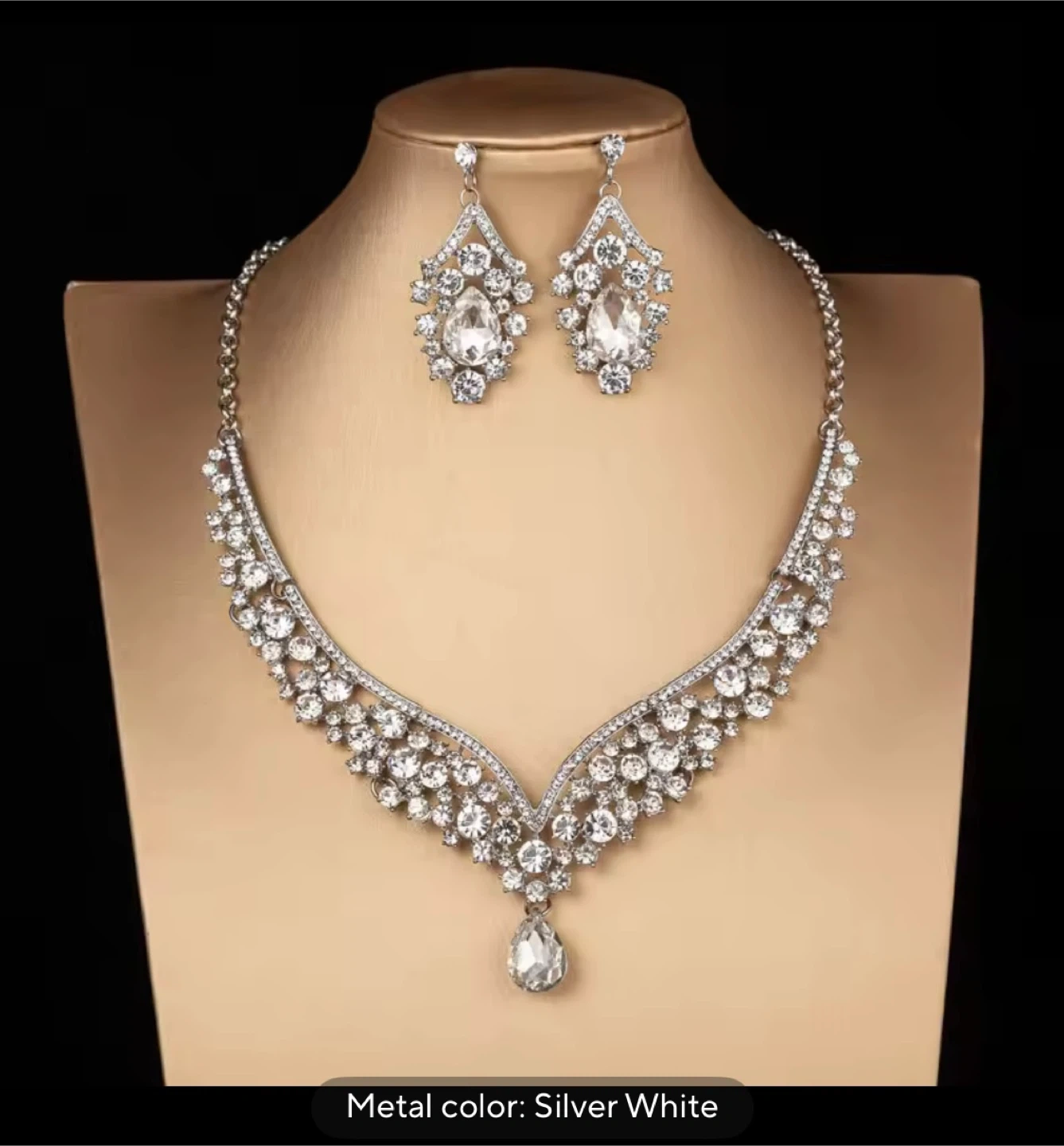 This gorgeous jewelry set features a crystal material and silver-white metal colour. It's a trendy bridal jewelry set made of zinc alloy. Perfect for adding a touch of sparkle to any outfit