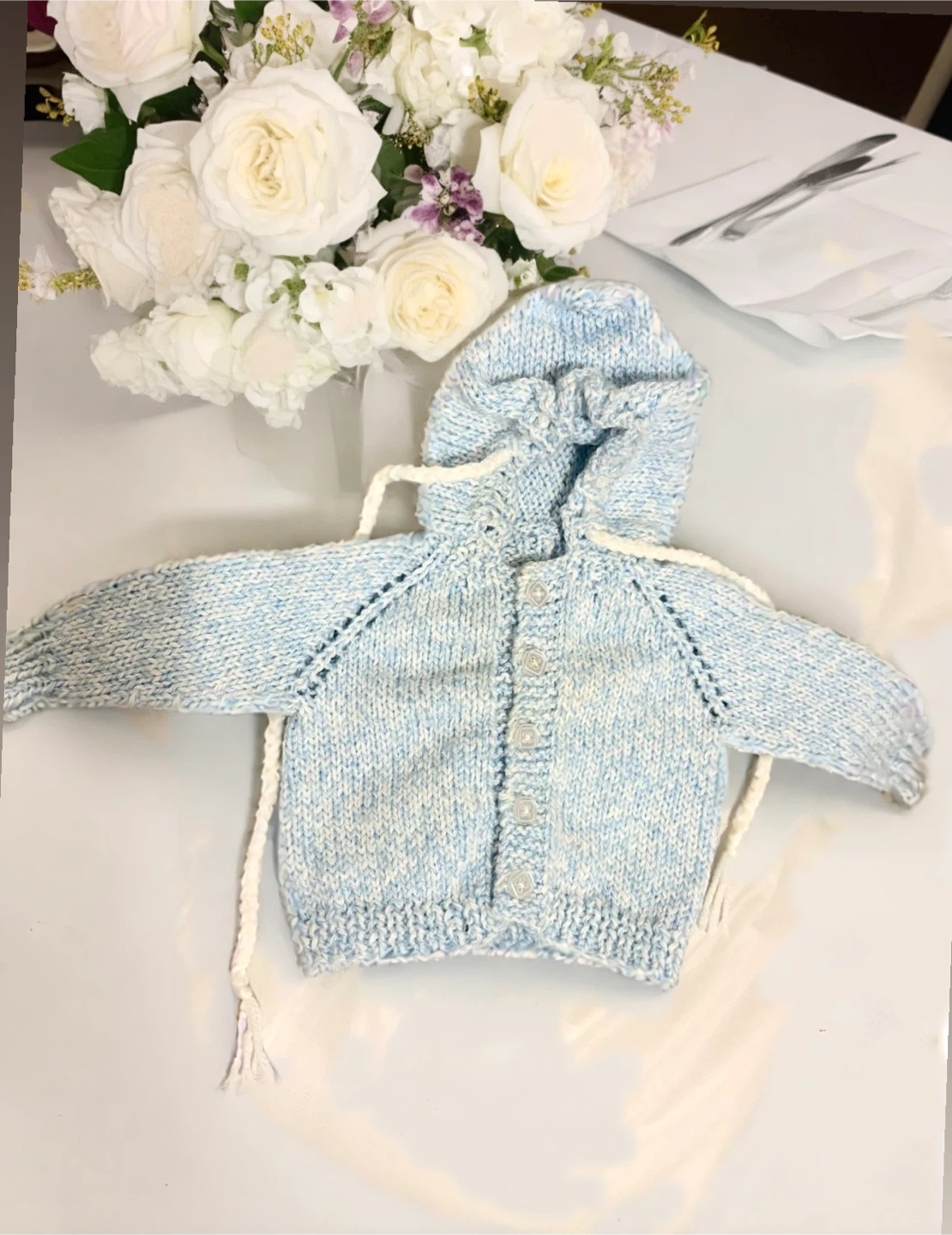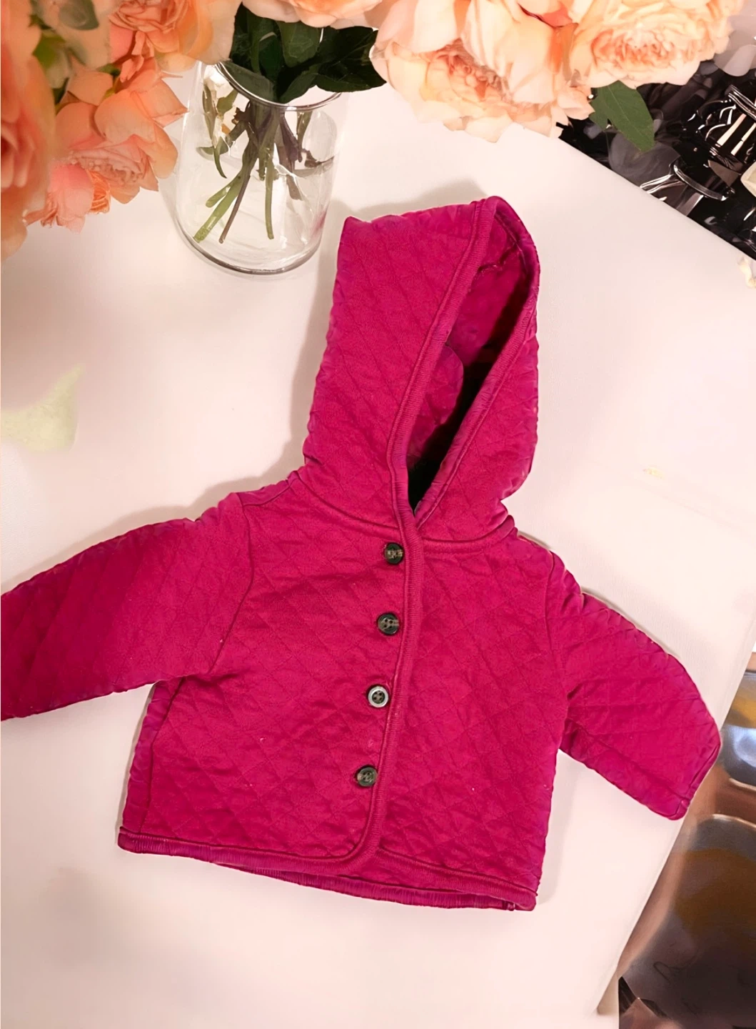 Selling two adorable baby hooded cardigans! One is a light blue knitted cardigan with a hood and button-up front. The other is a pink quilted cardigan with a hood and button-up front. Both are in great condition and perfect for keeping your little one cozy.