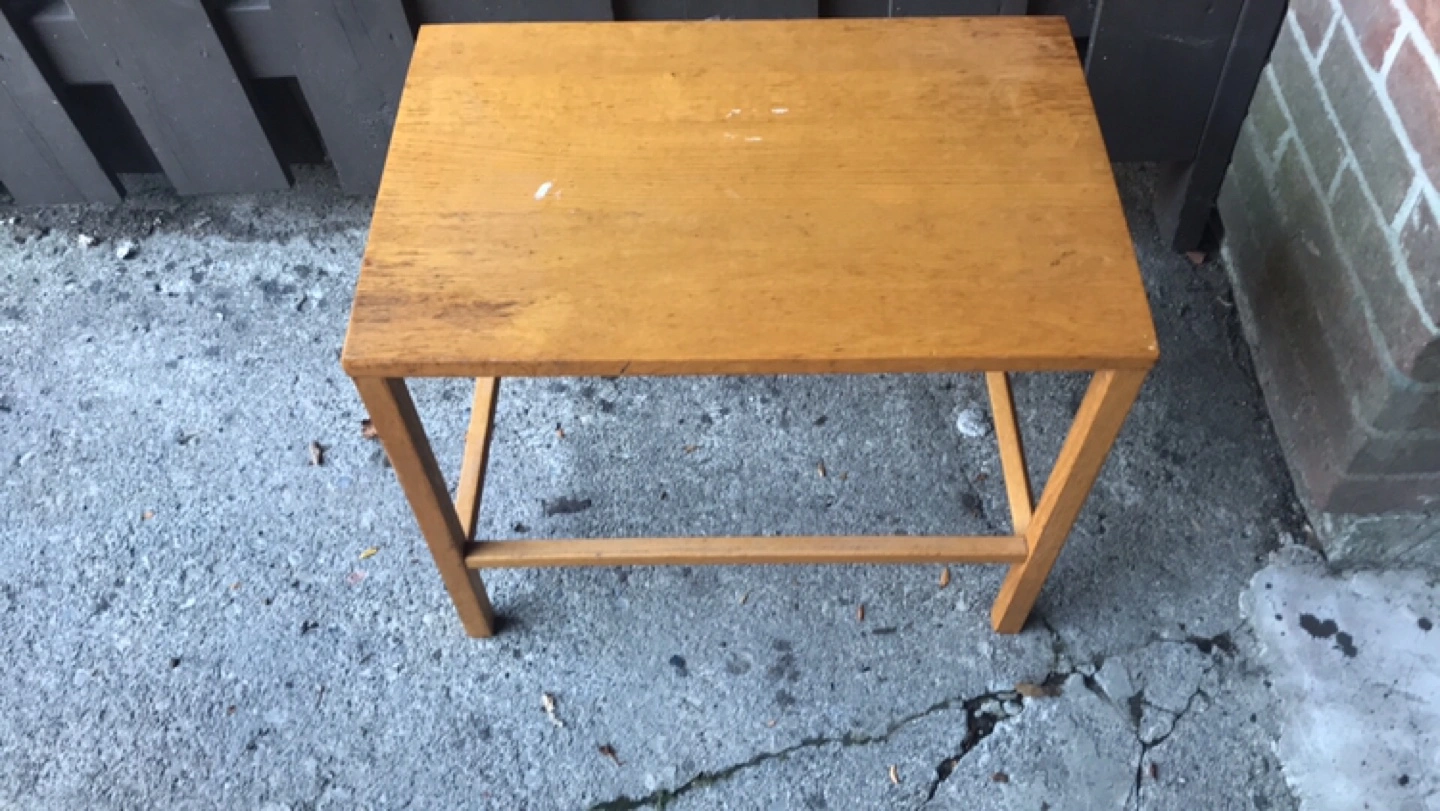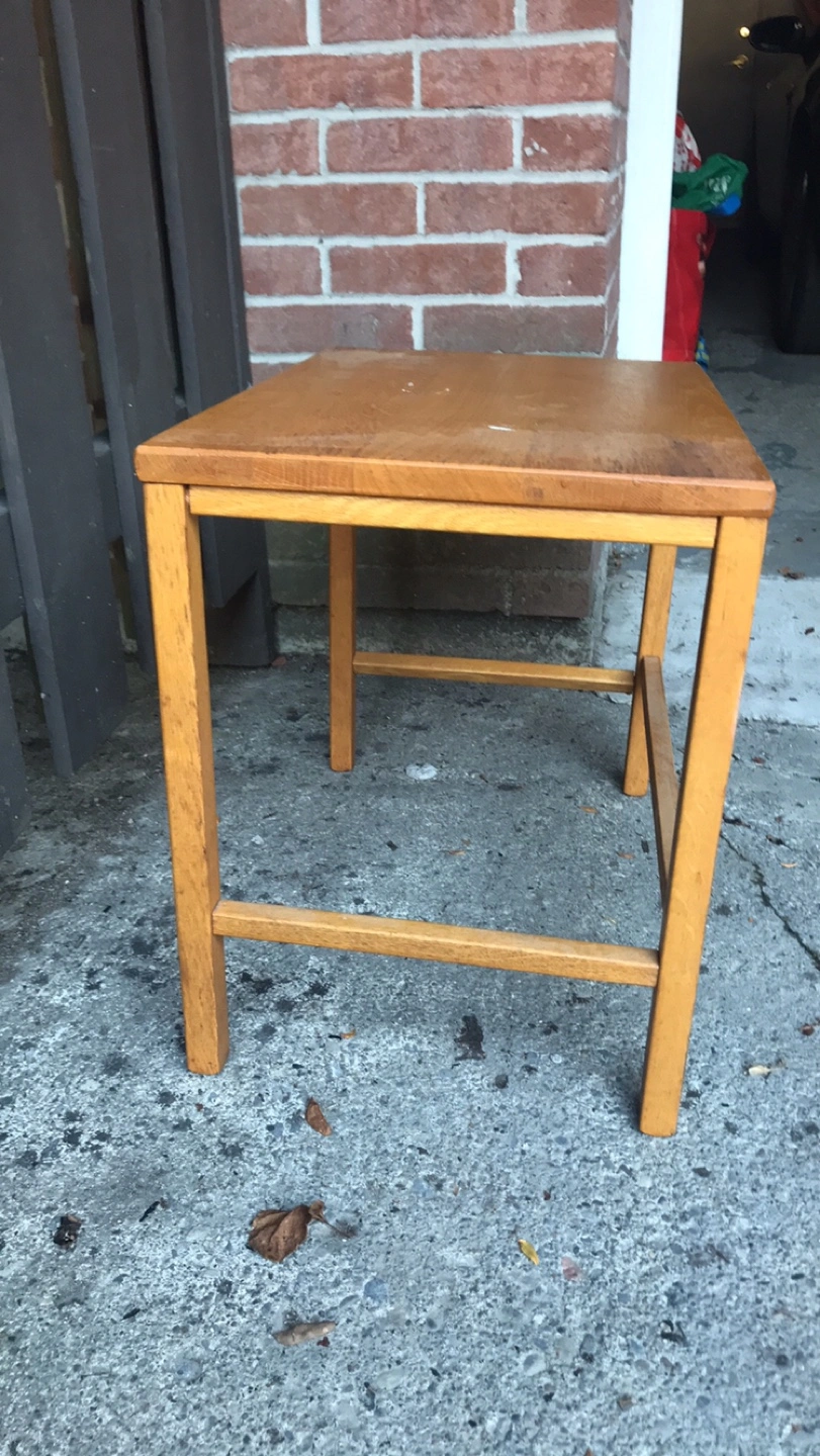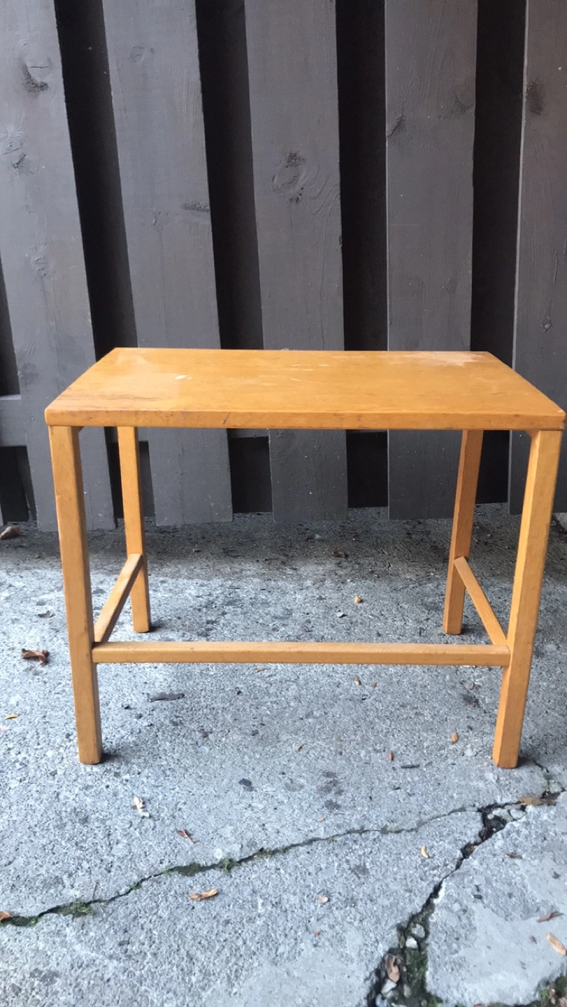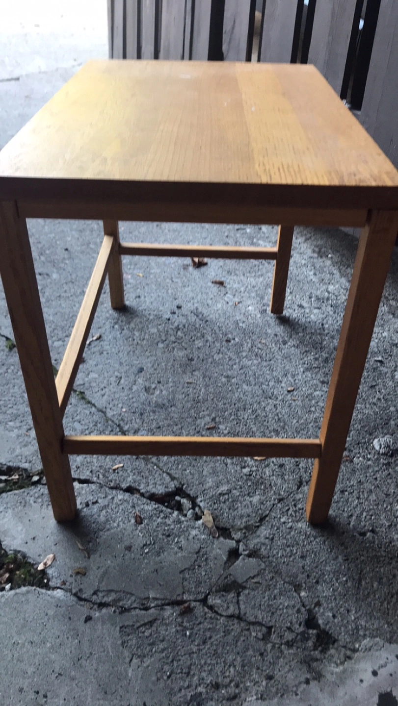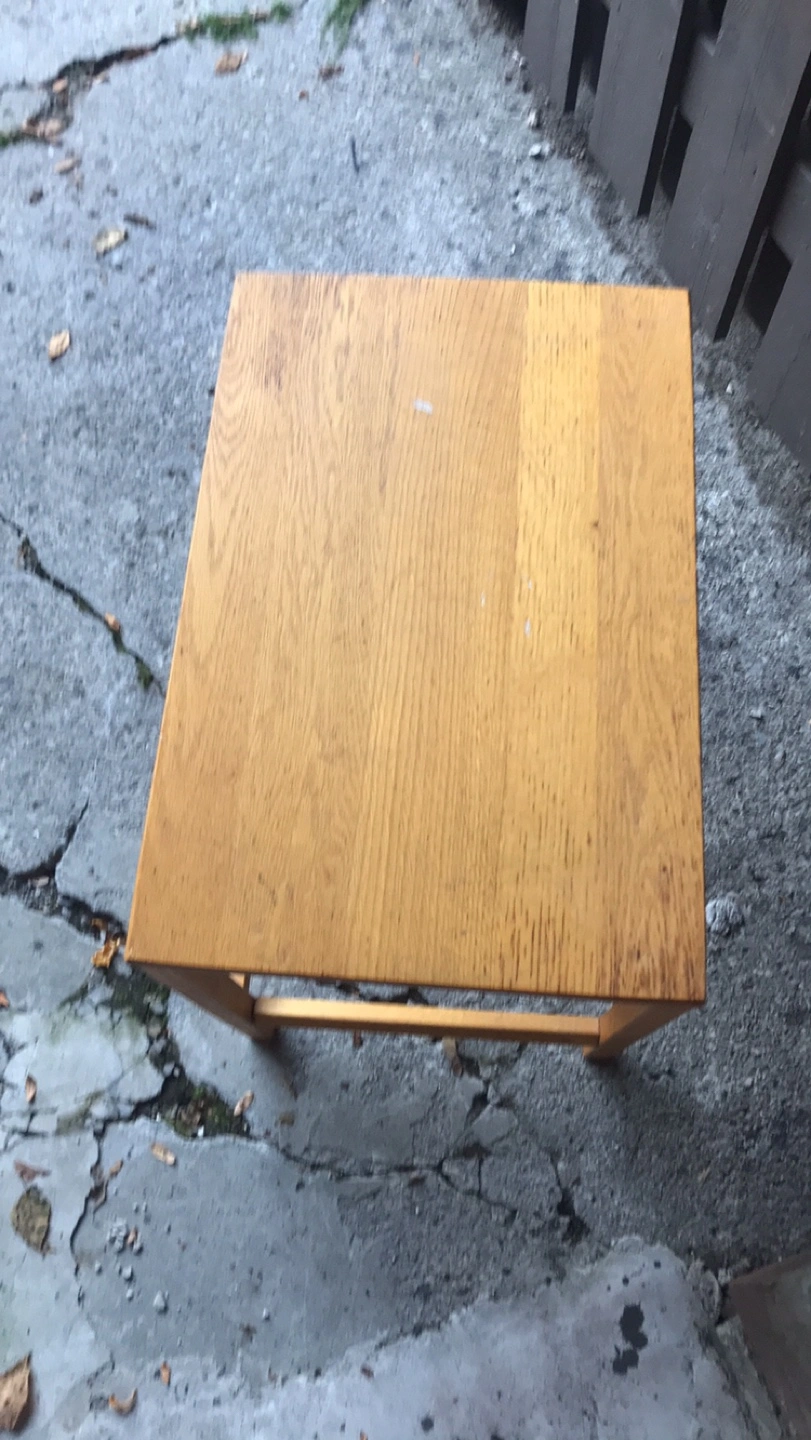 Selling a small wooden table. It's a light tan colour and has some wear and tear. The dimensions are 22 by 14 by 17 1/2 inches. Pick up location is 10 Alcorn Avenue M4V1E4