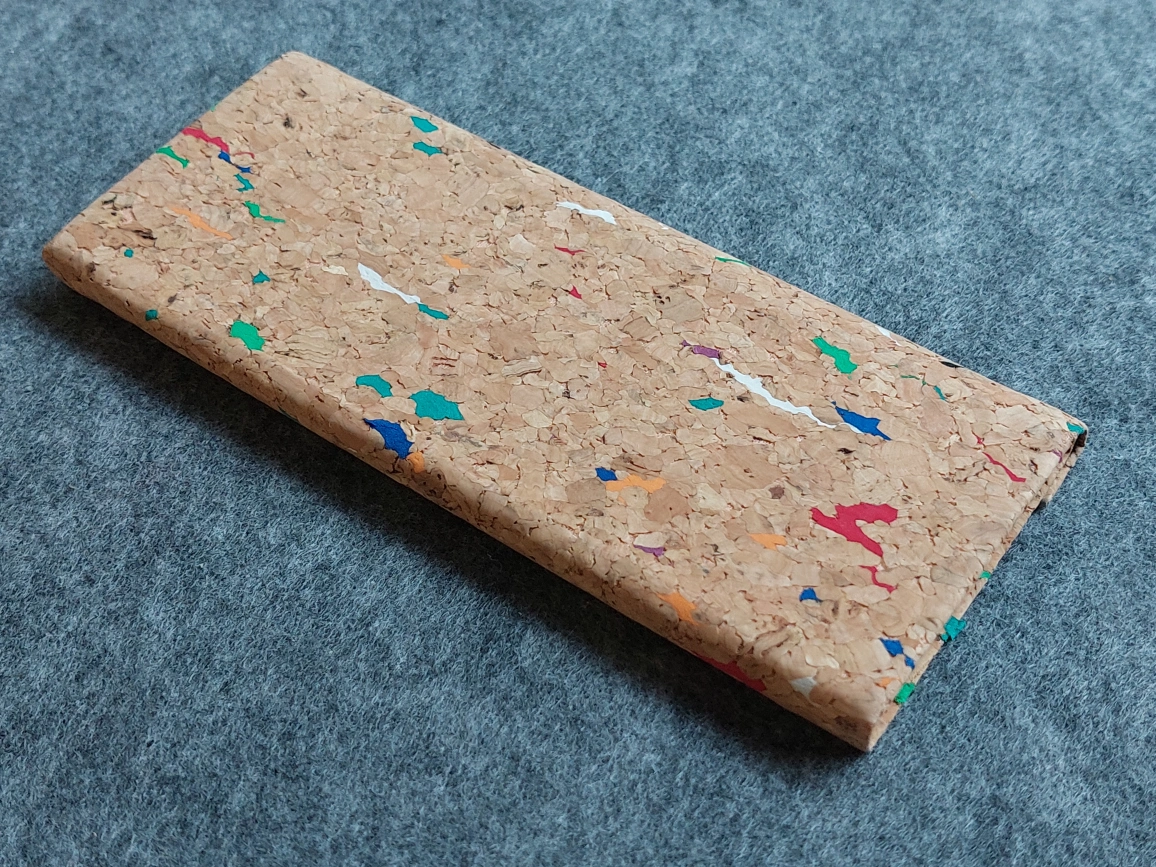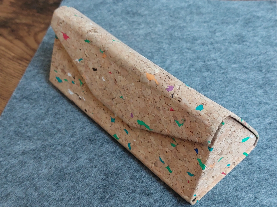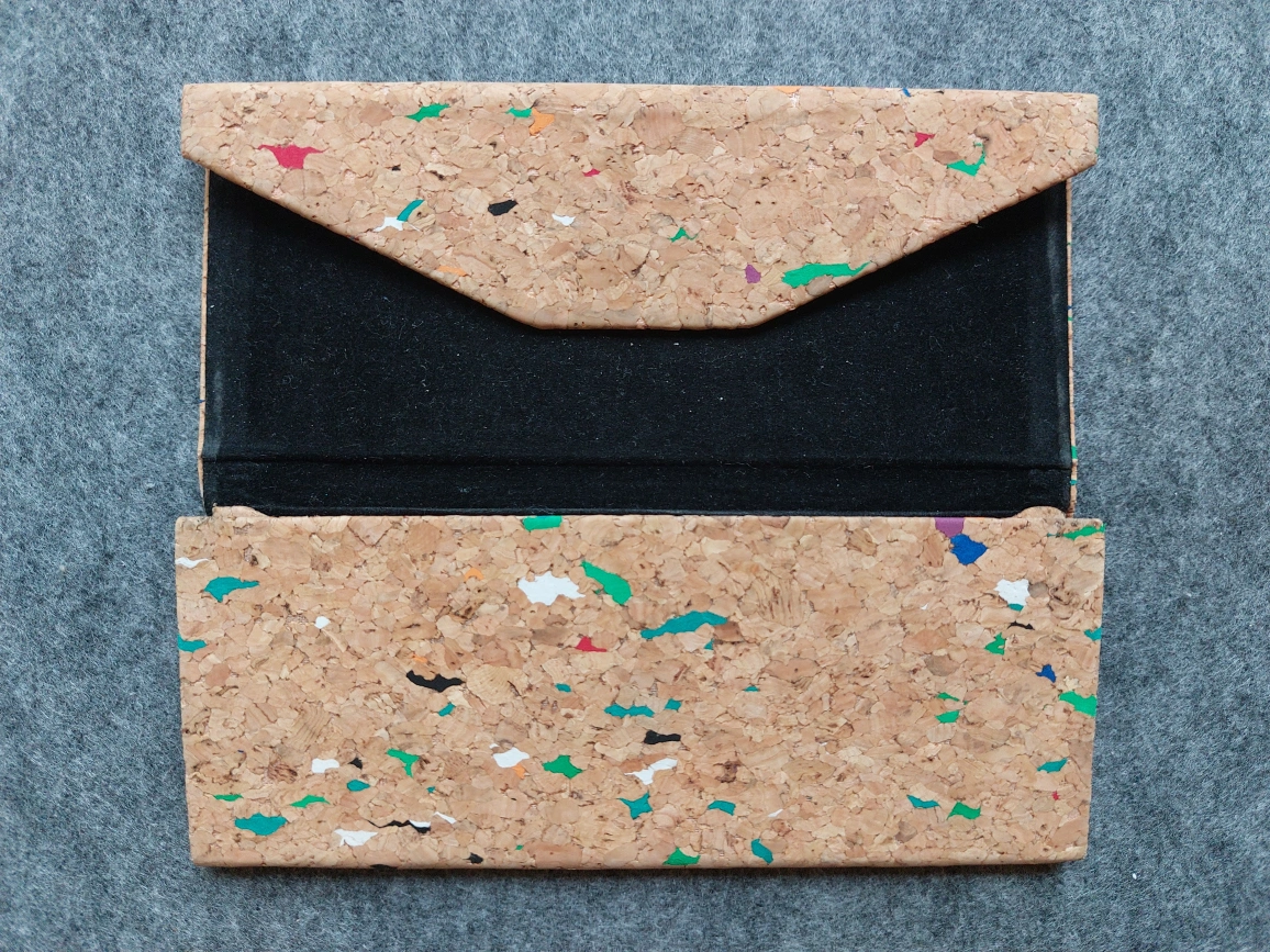 I'm selling this unique cork-lined glasses case! It's in great condition and has a fun, colourful speckled pattern throughout the cork material. The inside is lined with a soft black fabric to protect your glasses. It also collapses flat when not in use.