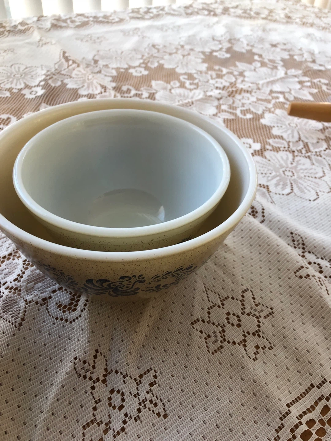 Selling a set of two vintage Pyrex bowls! They have a lovely floral pattern in blue on a tan/beige background. Perfect for adding a touch of retro charm to your kitchen!