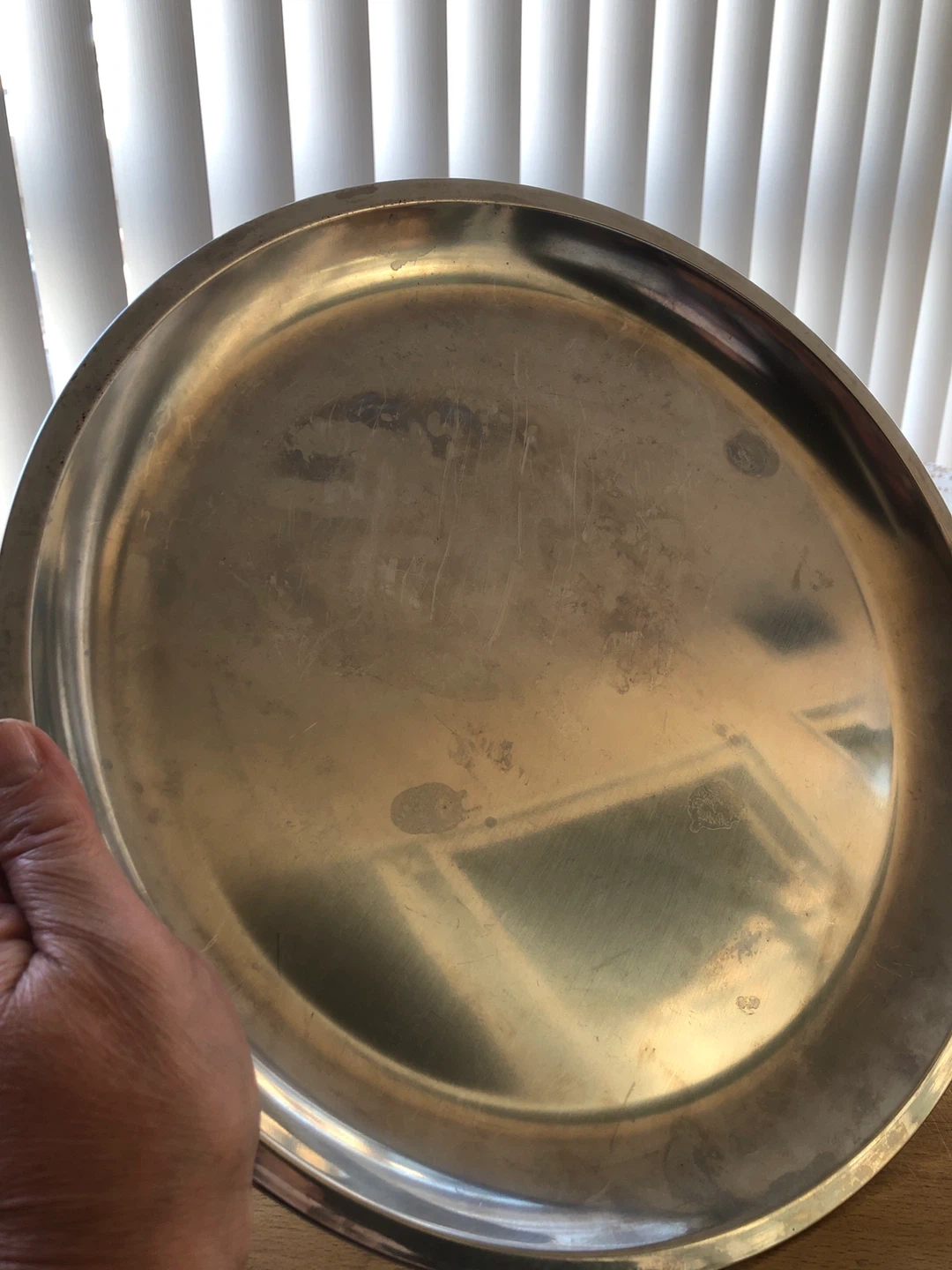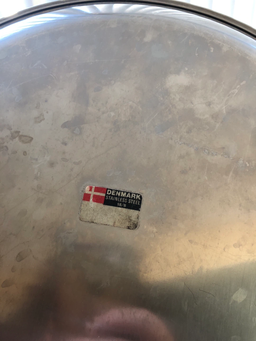 Selling a stainless steel serving tray. It has a Denmark Stainless Steel sticker on the bottom. It shows signs of use but is still functional